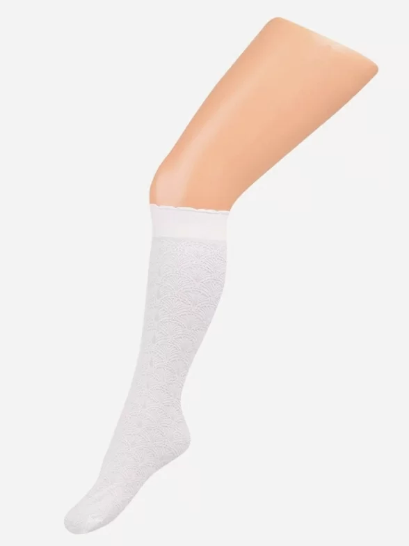 Элегантные гольфы для девочек, украшенные ненавязчивым фантазийным рисунком. Модель очень удобна, благодаря широкой мягкой резинке.