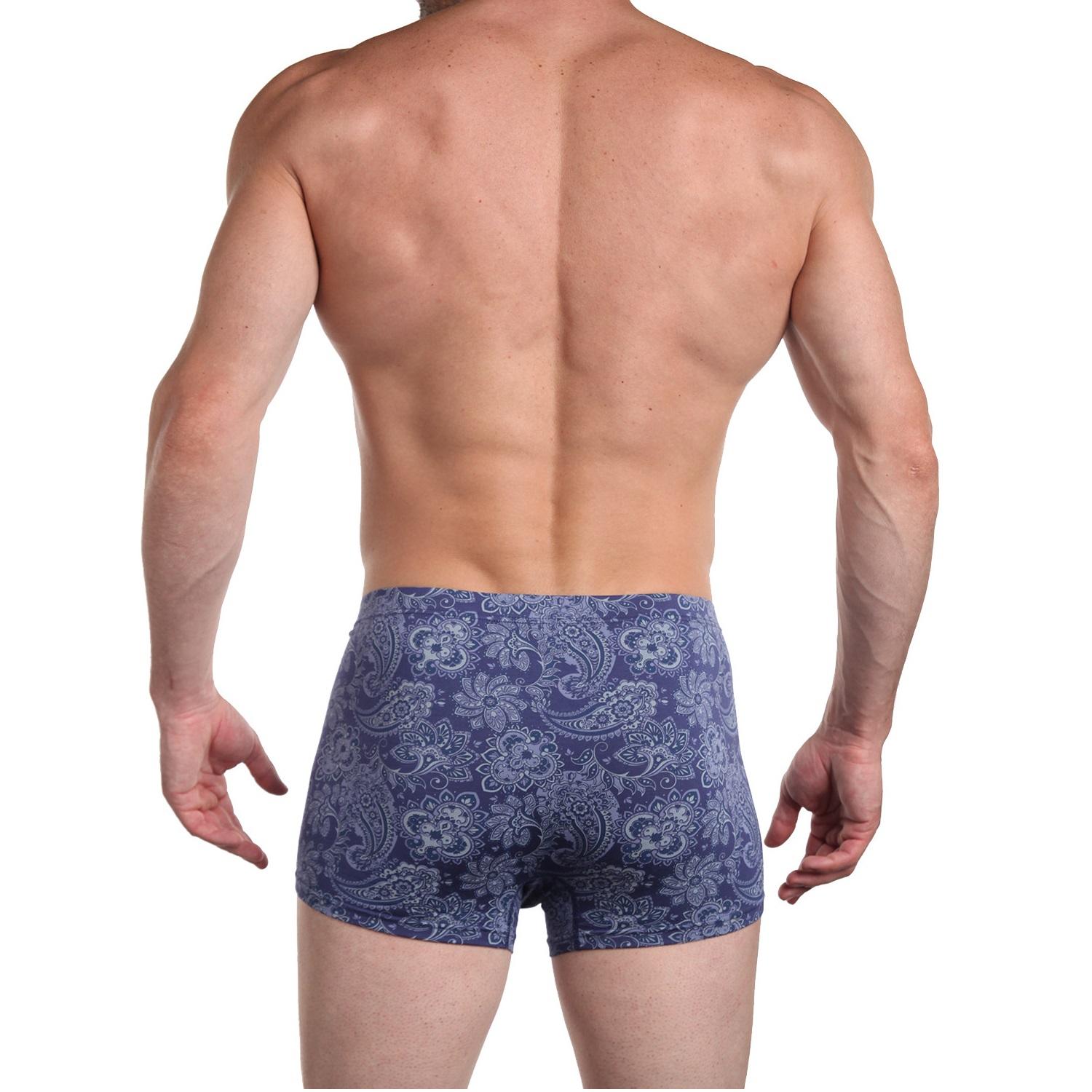 Обтягивающая модель стандартной посадки оформлена растительным орнаментом "пейсли", имеет вшитую эластичную резинку, украшенную аббревиатурой бренда; боковые швы отсутствуют.