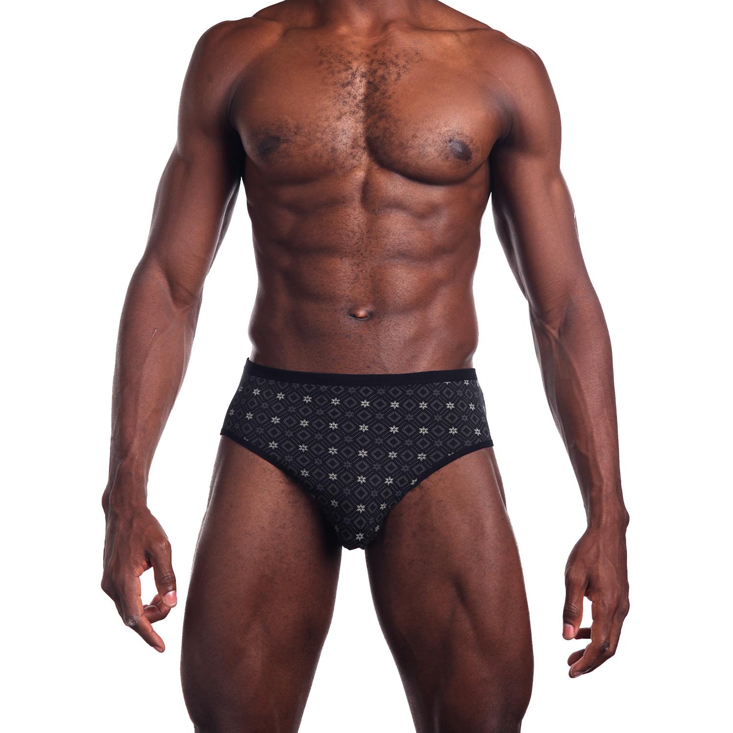 Облегающая модель стандартной посадки оформлена цветочно-геометрическим орнаментом; имеет вшитую узкую эластичную резинку и бочок средней ширины. Для удобства швы спрятаны в двойную подкладку гульфика.