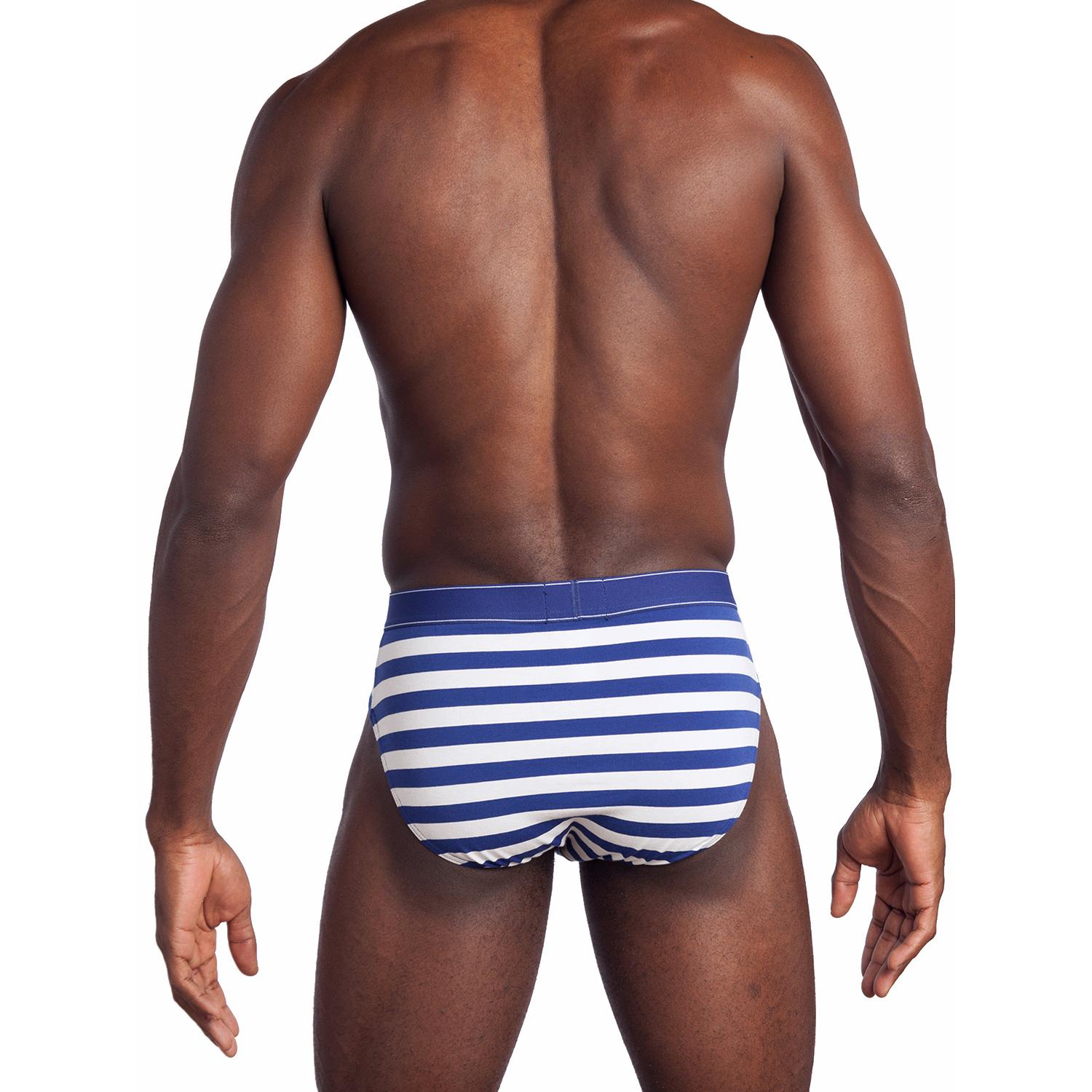 Облегающая модель стандартной посадки оформлена принтом в полоску; имеет широкую эластичную резинку, пришитую накладным тройным швом и украшенную спереди логотипом бренда, бочок средней ширины. Для удобства швы спрятаны в двойную подкладку гульфика.