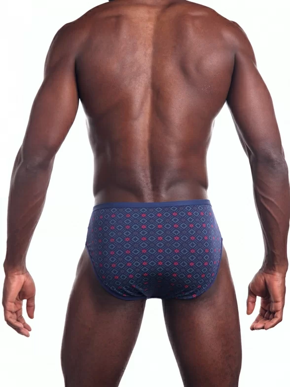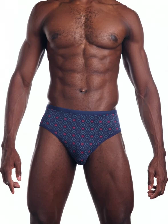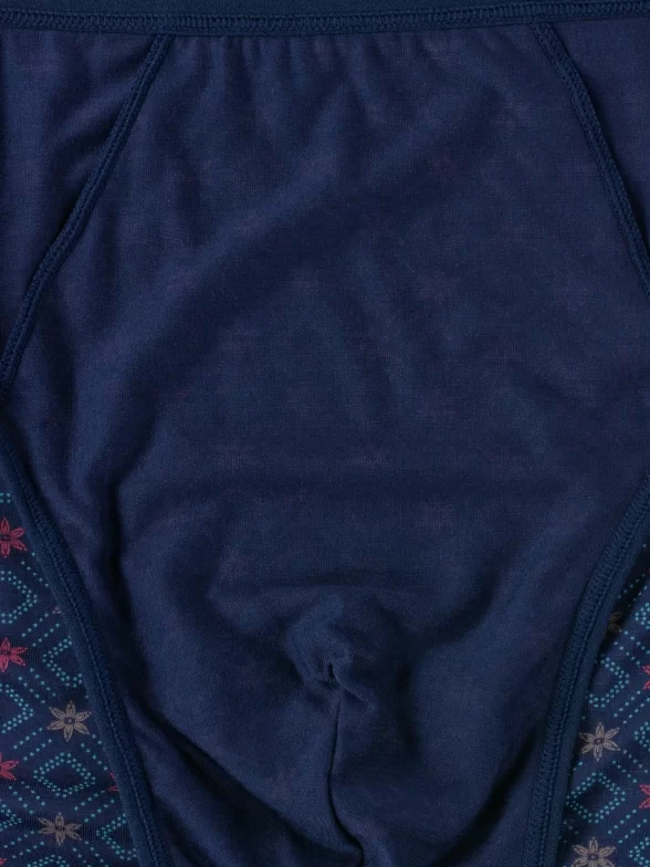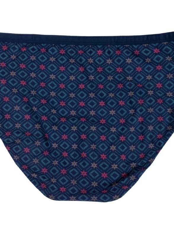Облегающая модель стандартной посадки оформлена цветочно-геометрическим орнаментом; имеет вшитую узкую эластичную резинку и бочок средней ширины. Для удобства швы спрятаны в двойную подкладку гульфика.
