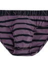 Облегающая модель стандартной посадки оформлена принтом в полоску; имеет широкую эластичную резинку, пришитую накладным тройным швом и украшенную спереди логотипом бренда, бочок средней ширины. Для удобства швы спрятаны в двойную подкладку гульфика.