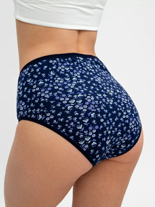 Облегающая модель с завышенной талией имеет 2 боковых шва, мягкую ластовицу из 100% хлопка и оформлена принтом в мелкий цветочек.