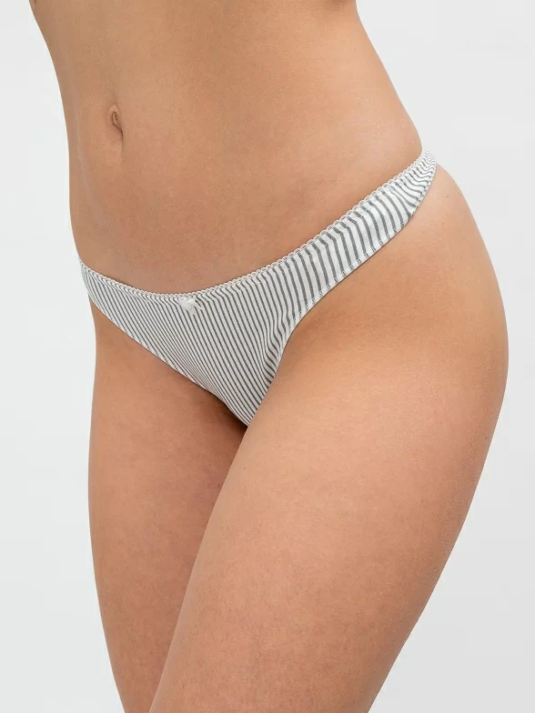 Облегающая модель заниженной посадки имеет 2 боковых шва, мягкую ластовицу из 100% хлопка и кружевную резинку; оформлены принтом в полоску.