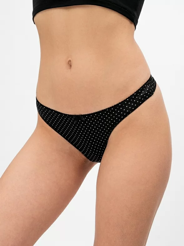 Облегающая модель заниженной посадки имеет 2 боковых шва, мягкую ластовицу из 100% хлопка и кружевную резинку; оформлены принтом в горошек.