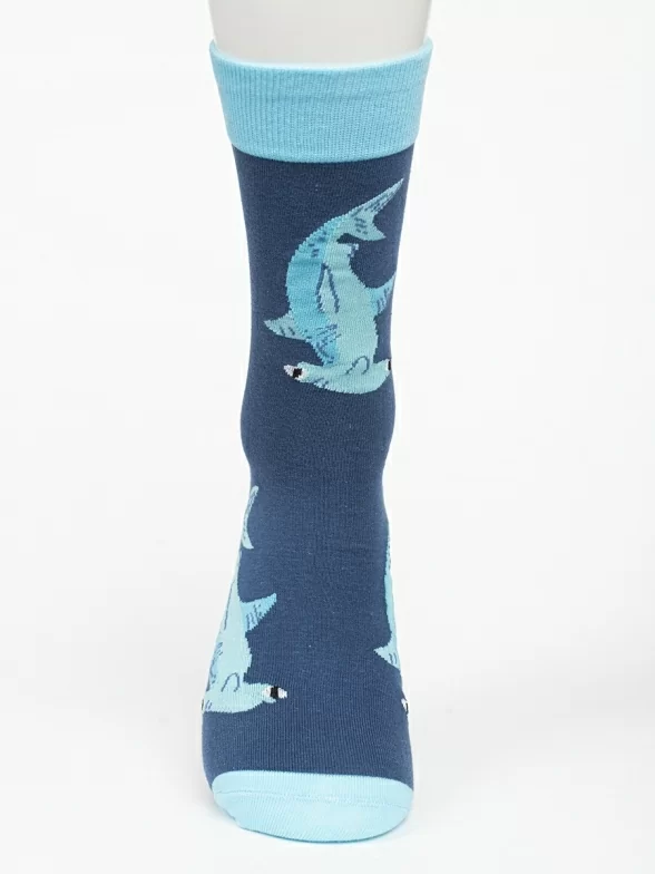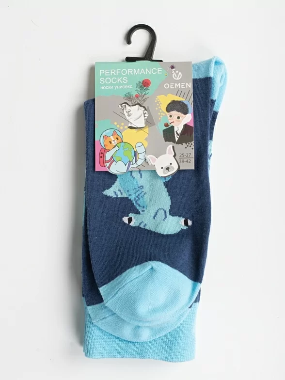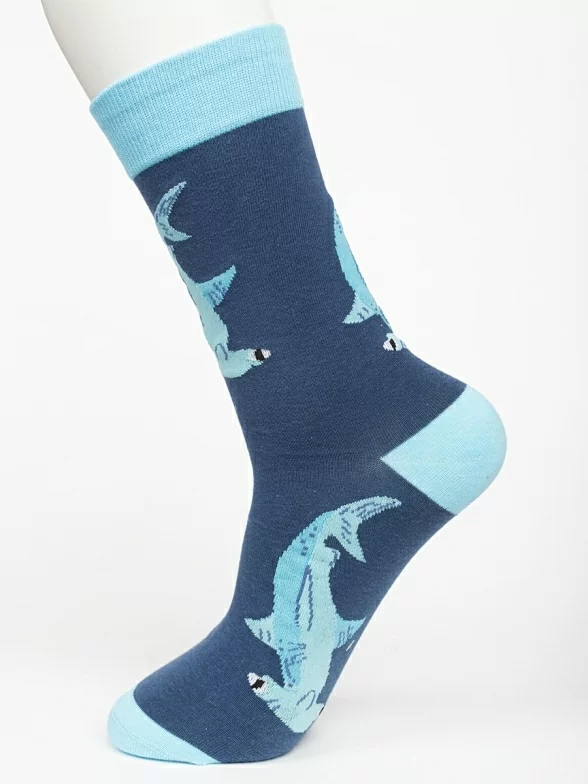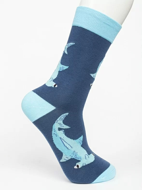 Круглогодичные средней длины носки унисекс, цвет синий, с принтом, шов обычный (не бесшовные), принт (рисунок): рыба, акула-молот, контрастные пятка/мысок/резинка, состав: 80% хлопок, 17% полиамид, 3% эластан, арт. PM388. Производитель «Oemen» Китай под брендом «Oemen».