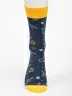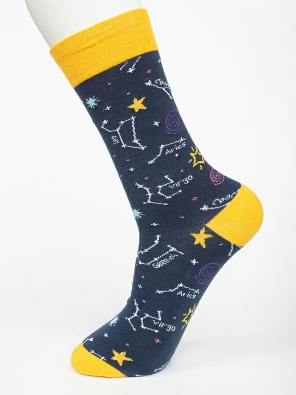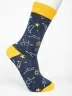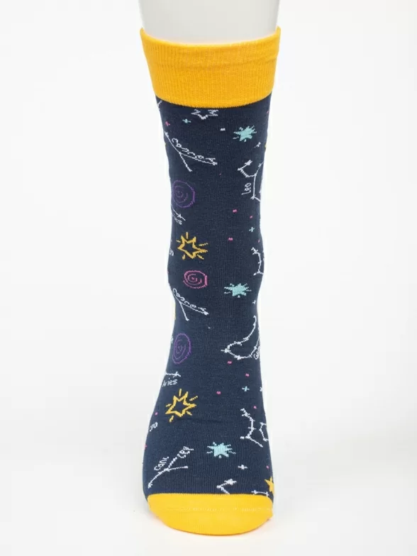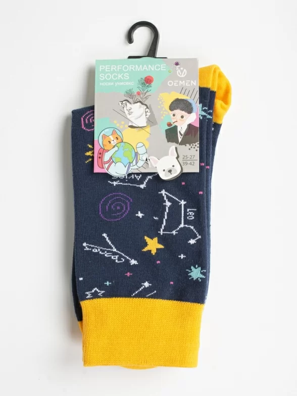 Круглогодичные средней длины носки унисекс, цвет синий-желтый, с принтом, шов обычный (не бесшовные), принт (рисунок): космос, созвездия, контрастные пятка/мысок/резинка, состав: 80% хлопок, 17% полиамид, 3% эластан, арт. PM391. Производитель «Oemen» Китай под брендом «Oemen».