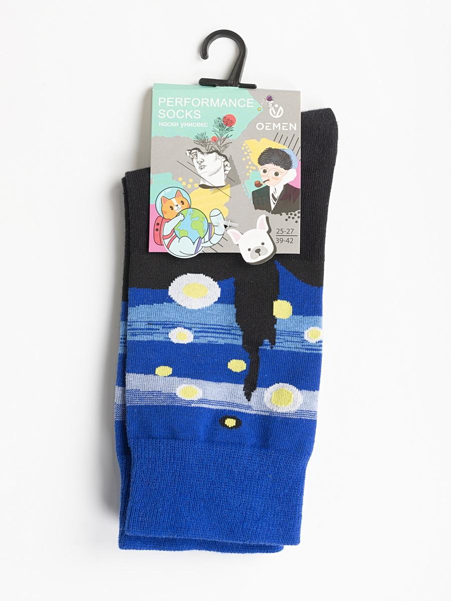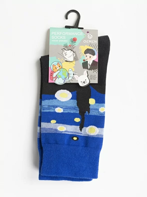Круглогодичные средней длины носки унисекс, цвет синий-черный, с принтом, шов обычный (не бесшовные), принт (рисунок): произведения искусства, Звездная ночь Ван Гог, контрастные пятка/мысок/резинка, абстрактный, состав: 80% хлопок, 17% полиамид, 3% эластан, арт. PM394. Производитель «Oemen» Китай под брендом «Oemen».