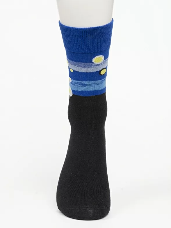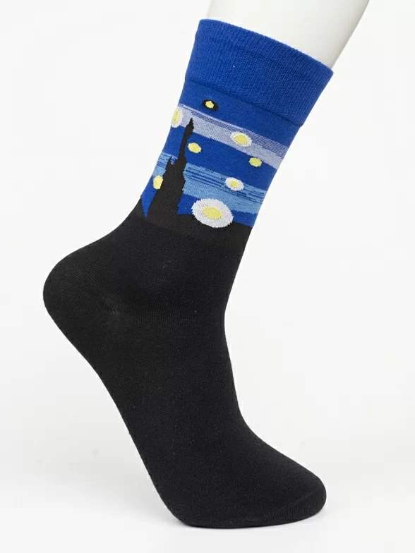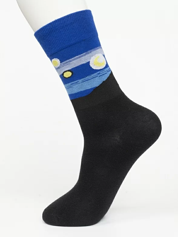 Круглогодичные средней длины носки унисекс, цвет синий-черный, с принтом, шов обычный (не бесшовные), принт (рисунок): произведения искусства, Звездная ночь Ван Гог, контрастные пятка/мысок/резинка, абстрактный, состав: 80% хлопок, 17% полиамид, 3% эластан, арт. PM394-1. Производитель «Oemen» Китай под брендом «Oemen».
