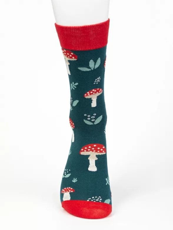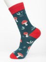 Круглогодичные средней длины носки унисекс, цвет красный-зеленый, с принтом, шов обычный (не бесшовные), принт (рисунок): контрастные пятка/мысок/резинка, гриб мухомор, состав: 80% хлопок, 17% полиамид, 3% эластан, арт. PM395. Производитель «Oemen» Китай под брендом «Oemen».