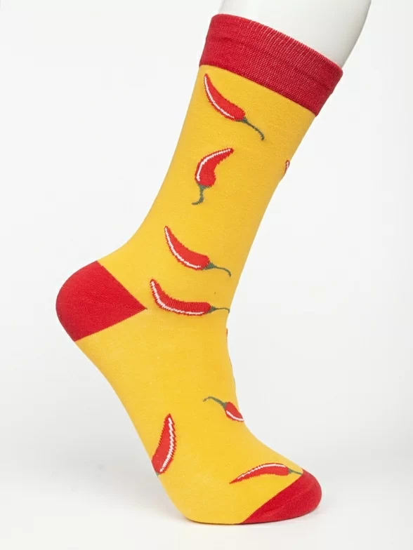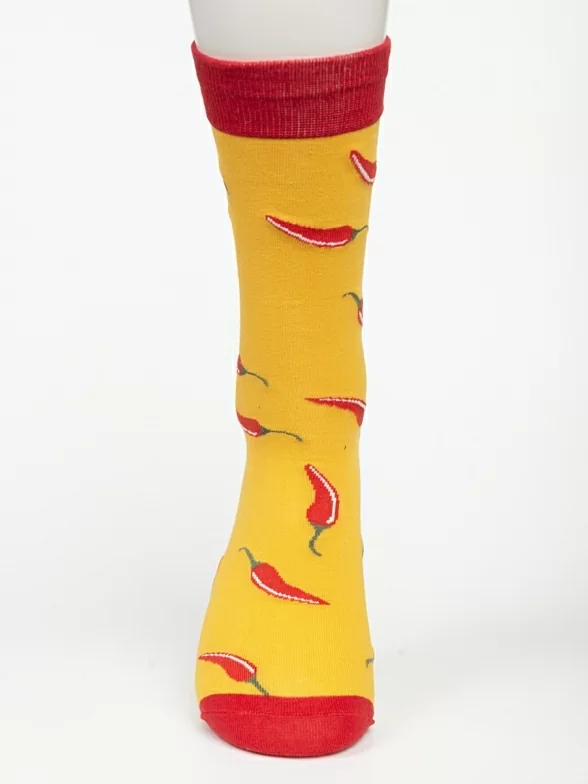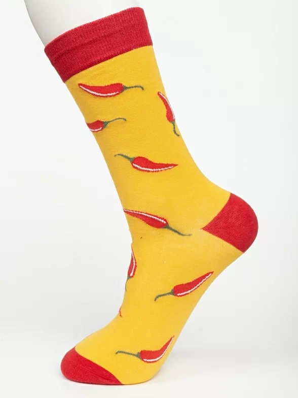 Круглогодичные средней длины носки унисекс, цвет красный-желтый, с принтом, шов обычный (не бесшовные), принт (рисунок): перчик чили, контрастные пятка/мысок/резинка, состав: 80% хлопок, 17% полиамид, 3% эластан, арт. PM396. Производитель «Oemen» Китай под брендом «Oemen».