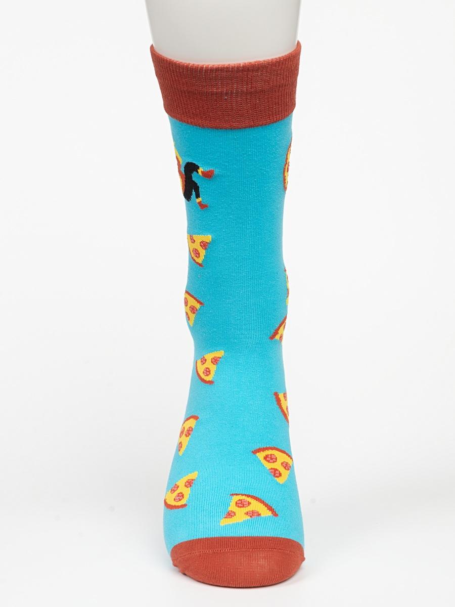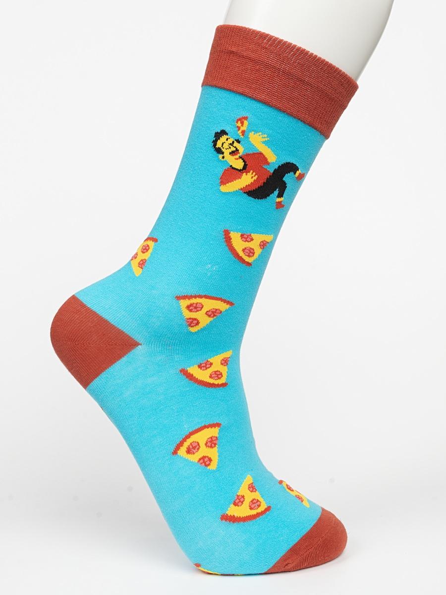 Круглогодичные средней длины носки унисекс, цвет голубой, с принтом, шов обычный (не бесшовные), принт (рисунок): контрастные пятка/мысок/резинка, еда, пицца, состав: 80% хлопок, 17% полиамид, 3% эластан, арт. PM399. Производитель «Oemen» Китай под брендом «Oemen».