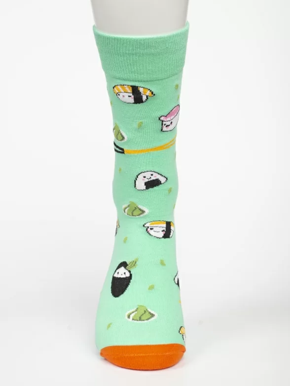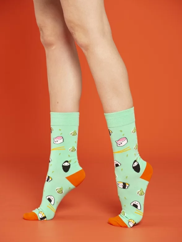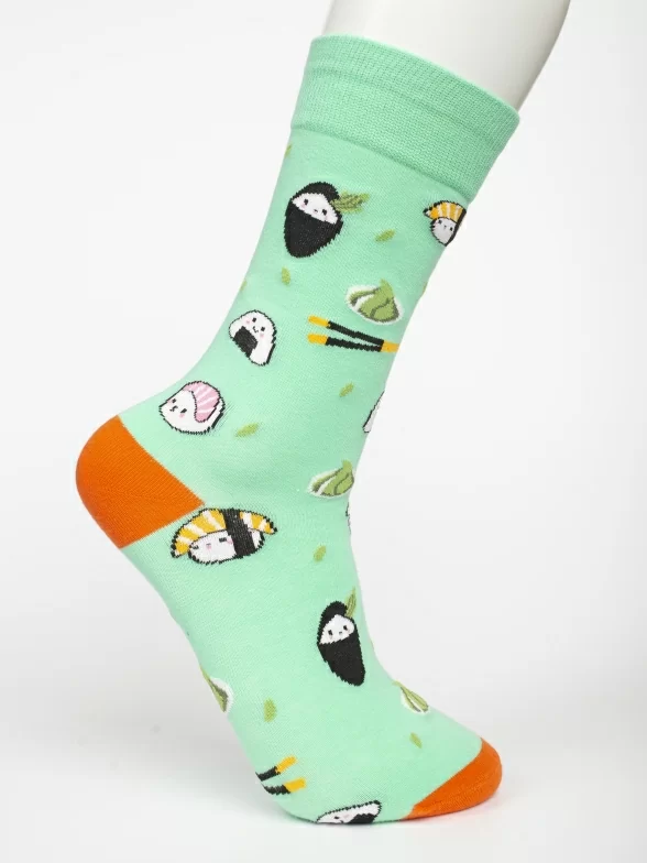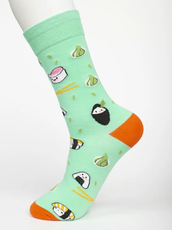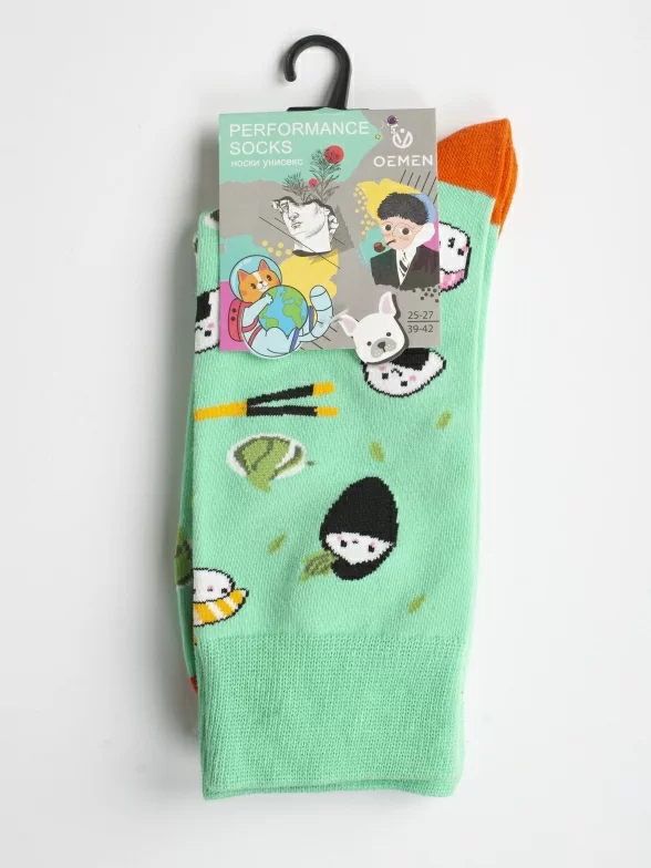 Круглогодичные средней длины носки унисекс, цвет зеленый, с принтом, шов обычный (не бесшовные), принт (рисунок): еда, суши, контрастные пятка/мысок/резинка, состав: 80% хлопок, 17% полиамид, 3% эластан, арт. PM400. Производитель «Oemen» Китай под брендом «Oemen».