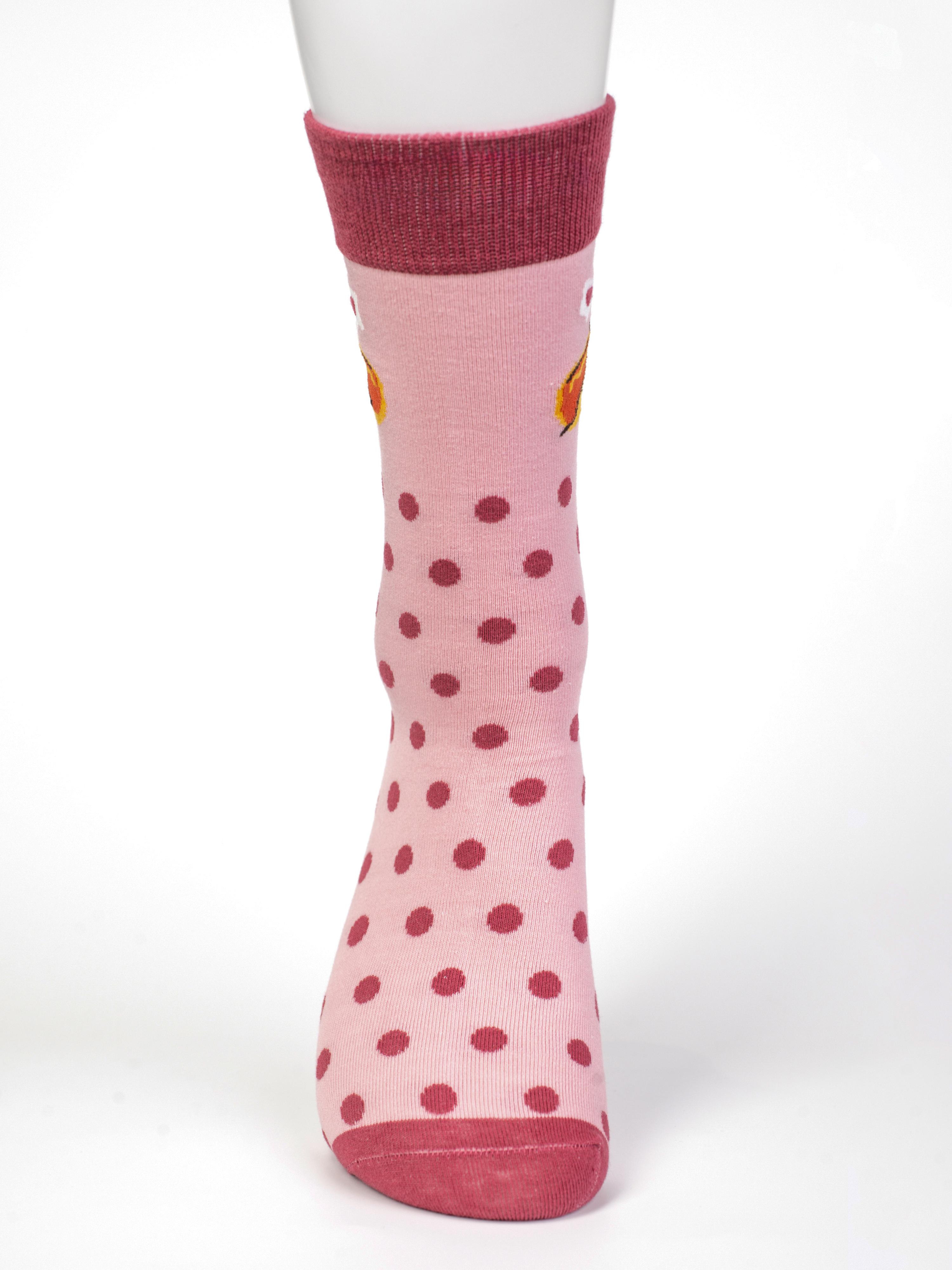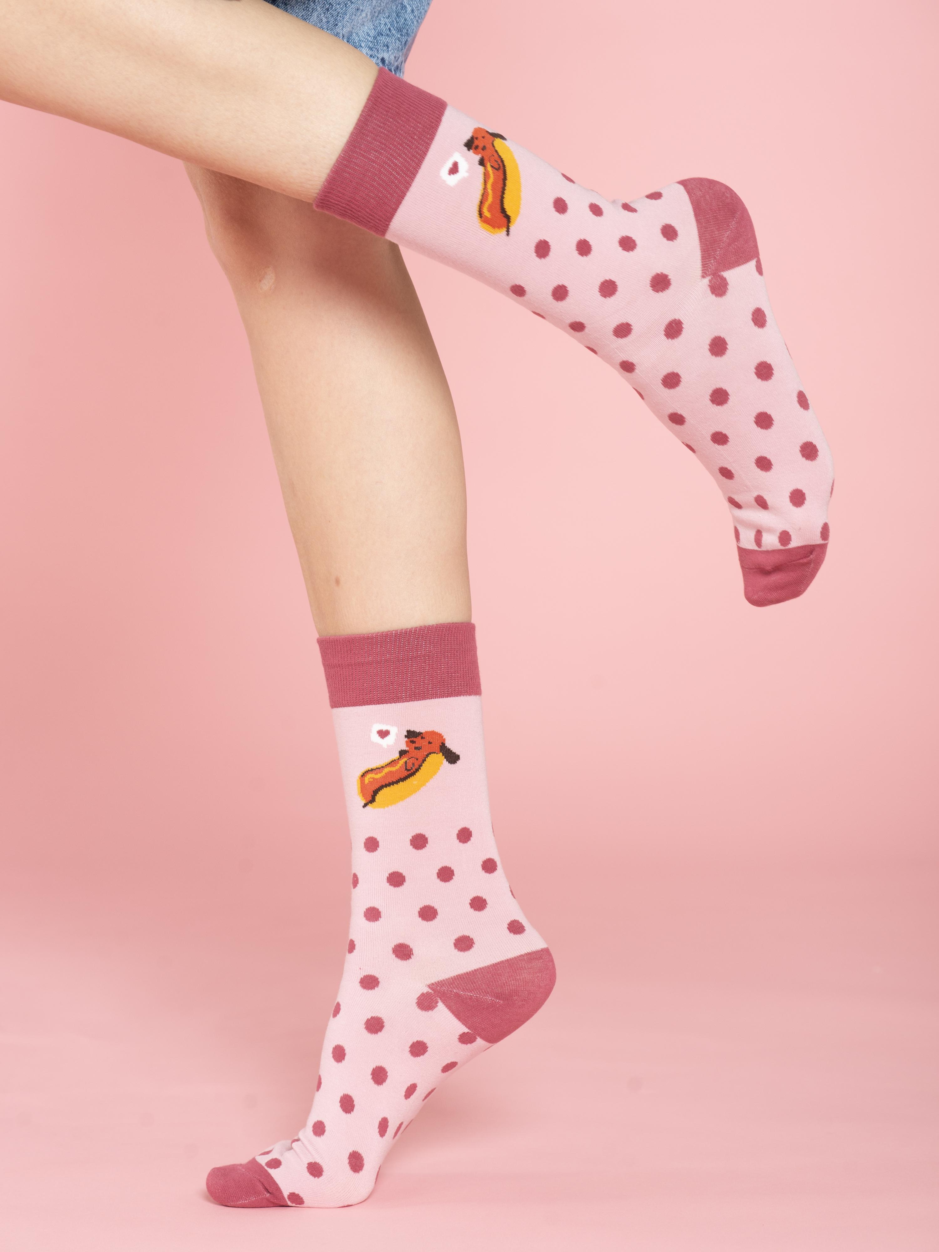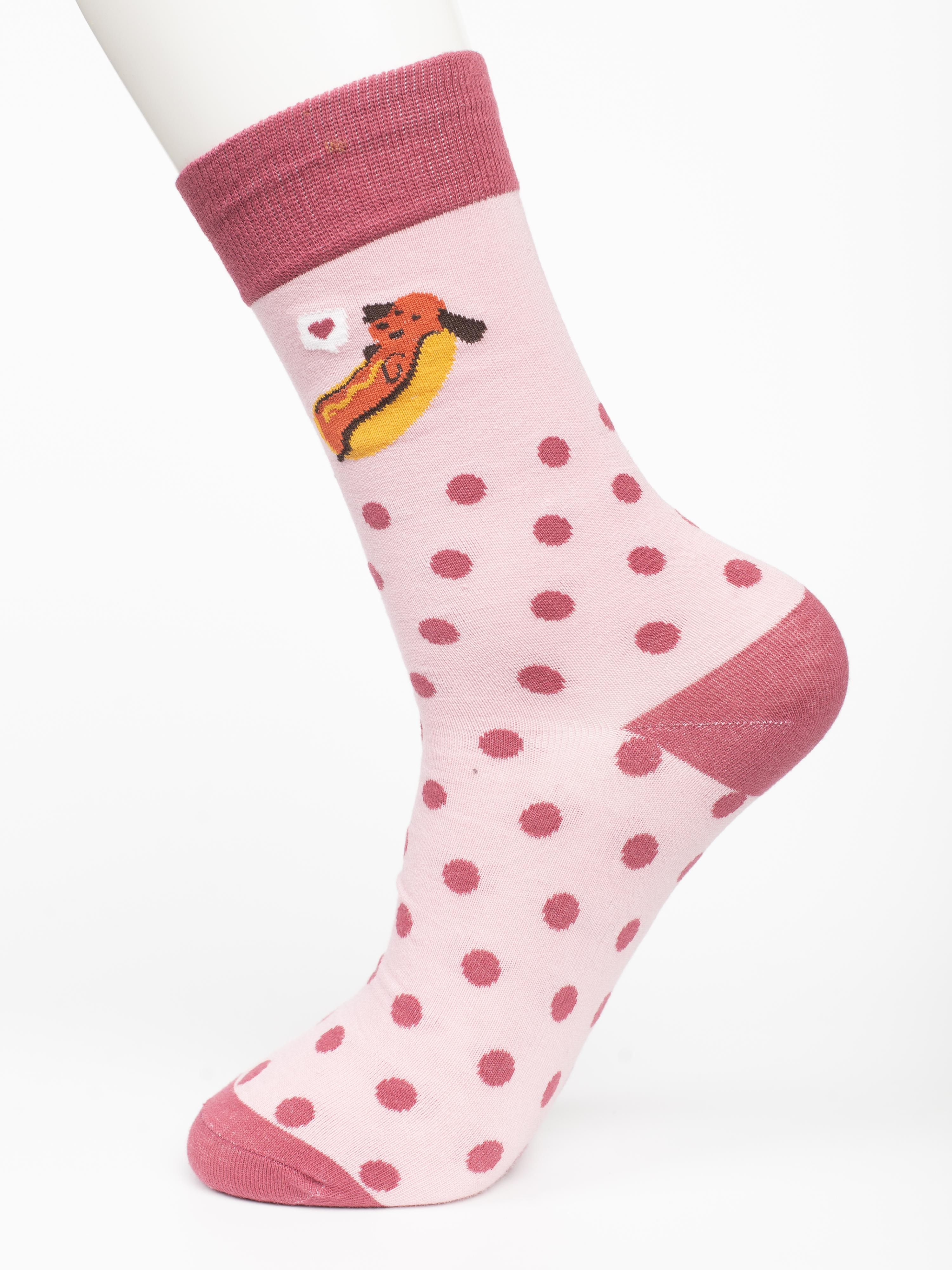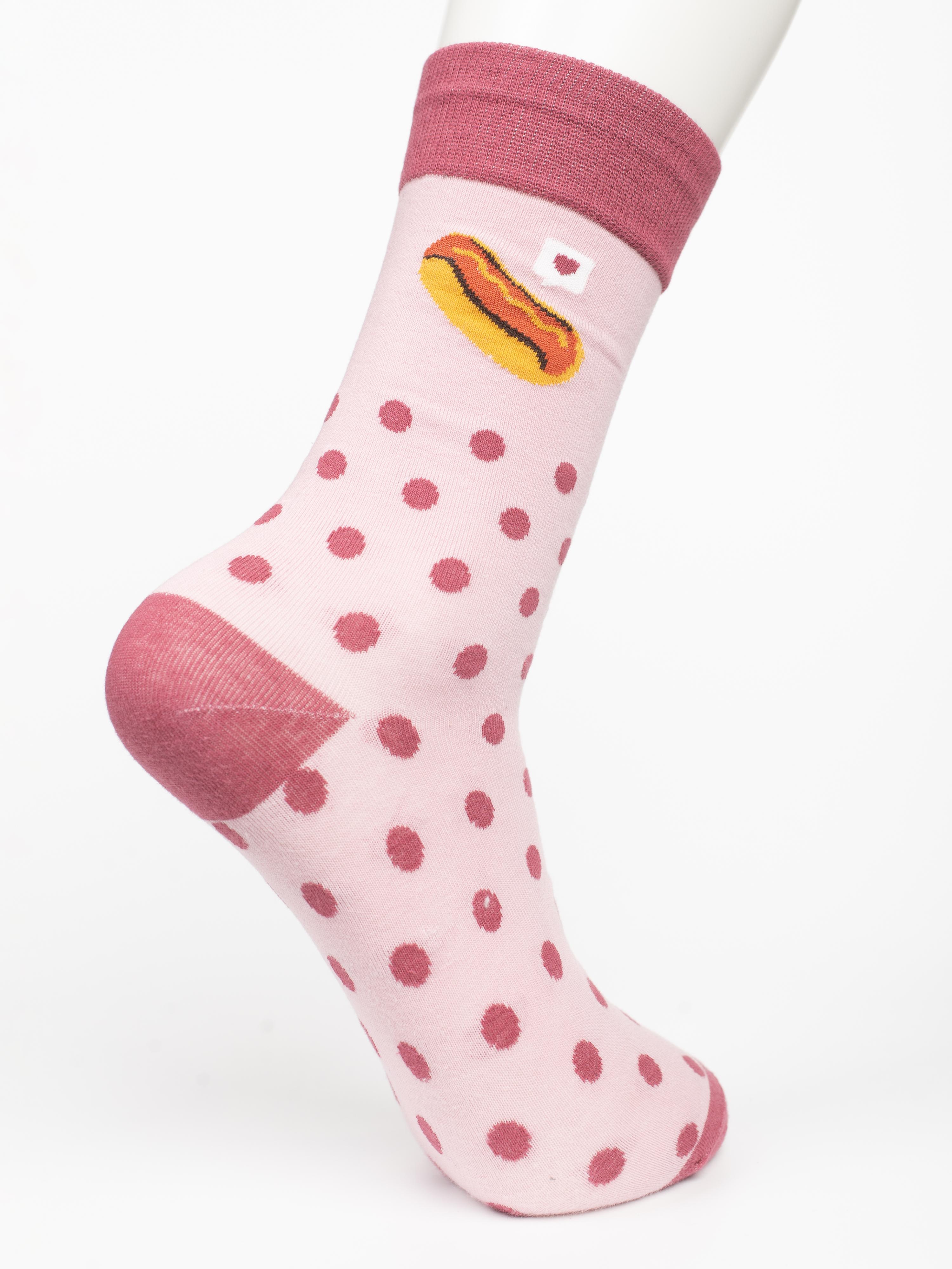 Круглогодичные средней длины носки унисекс, цвет розовый, с принтом, шов обычный (не бесшовные), принт (рисунок): еда, хот-дог, контрастные пятка/мысок/резинка, горох / точка, состав: 80% хлопок, 17% полиамид, 3% эластан, арт. PM401. Производитель «Oemen» Китай под брендом «Oemen».