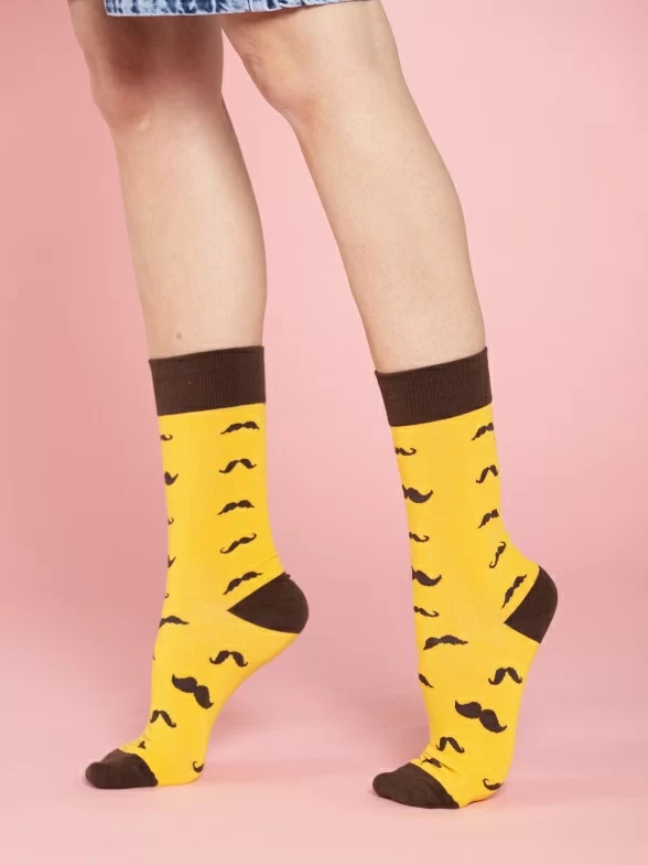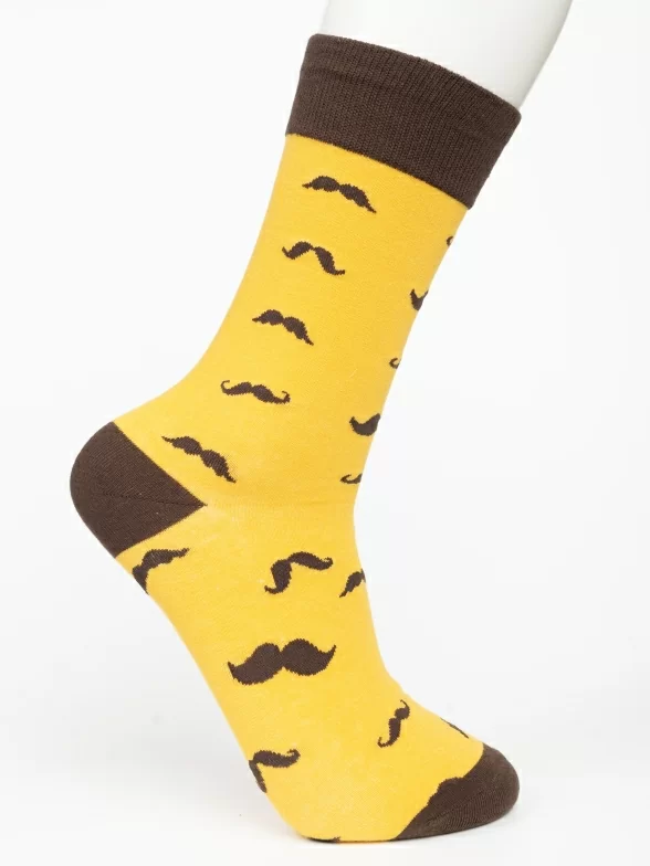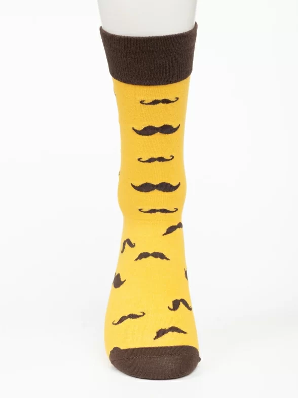 Круглогодичные средней длины носки унисекс, цвет коричневый-желтый, с принтом, шов обычный (не бесшовные), принт (рисунок): усы, контрастные пятка/мысок/резинка, состав: 80% хлопок, 17% полиамид, 3% эластан, арт. PM407. Производитель «Oemen» Китай под брендом «Oemen».