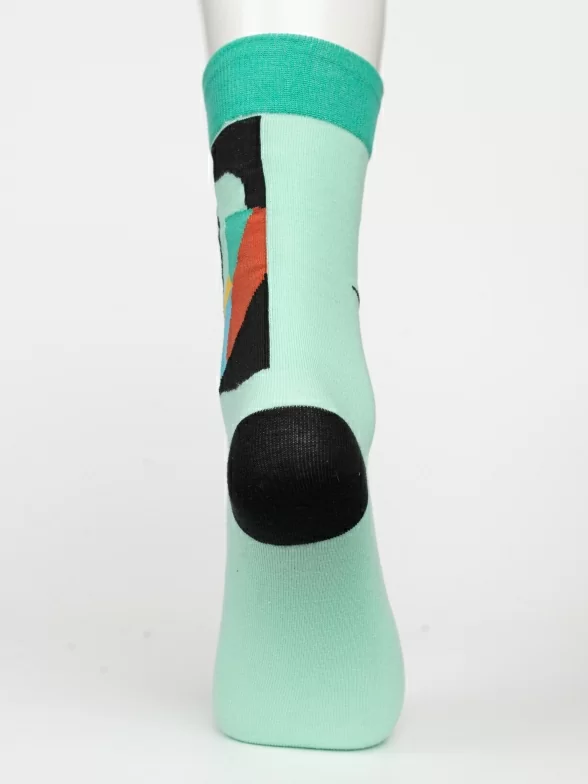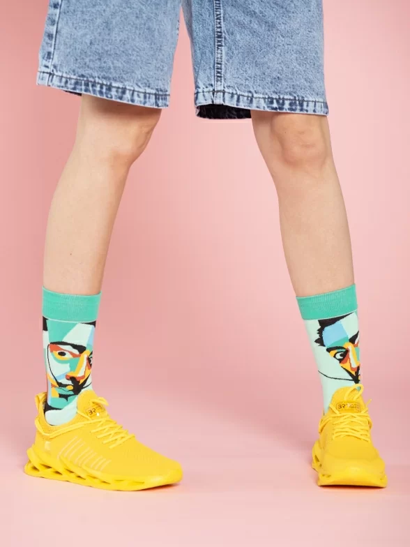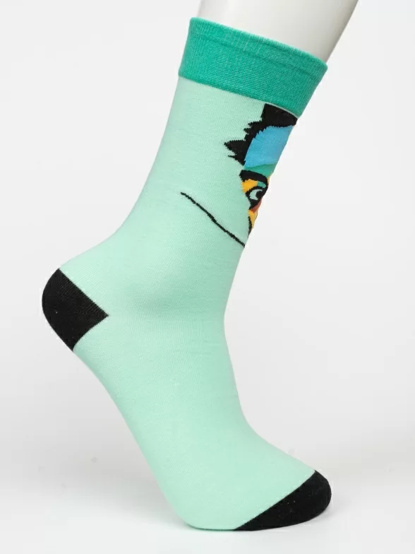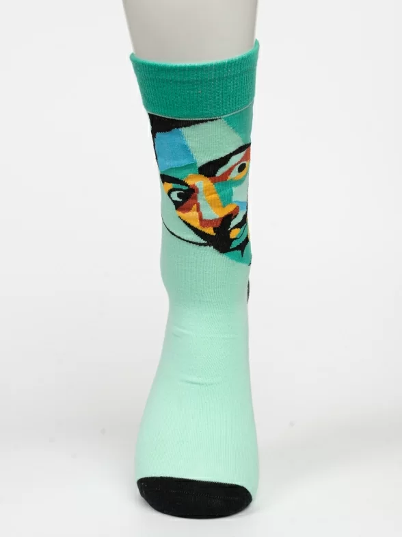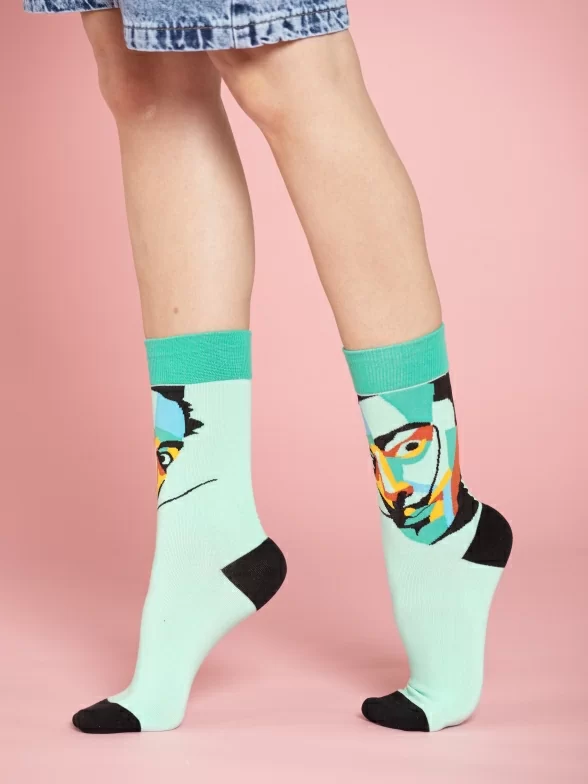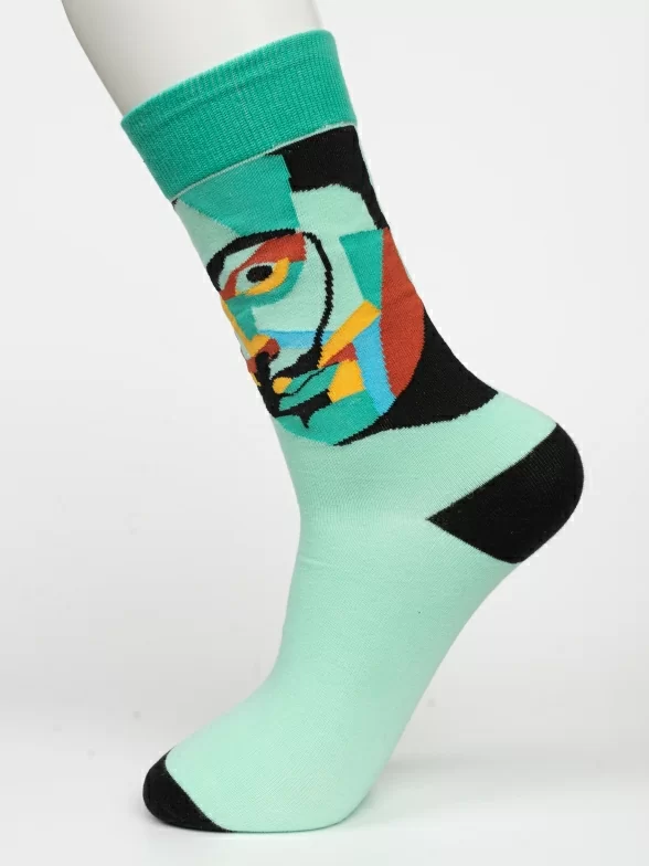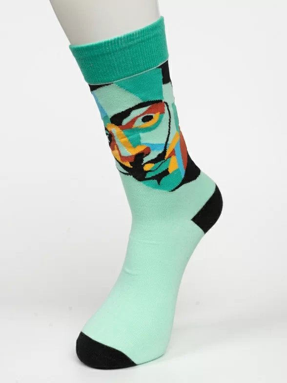 Круглогодичные средней длины носки унисекс, цвет бирюзовый, с принтом, шов обычный (не бесшовные), принт (рисунок): произведения искусства / цитаты, контрастные пятка/мысок/резинка, абстрактный, знаменитости, Сальвадор Дали, состав: 80% хлопок, 17% полиамид, 3% эластан, арт. PM408. Производитель «Oemen» Китай под брендом «Oemen».