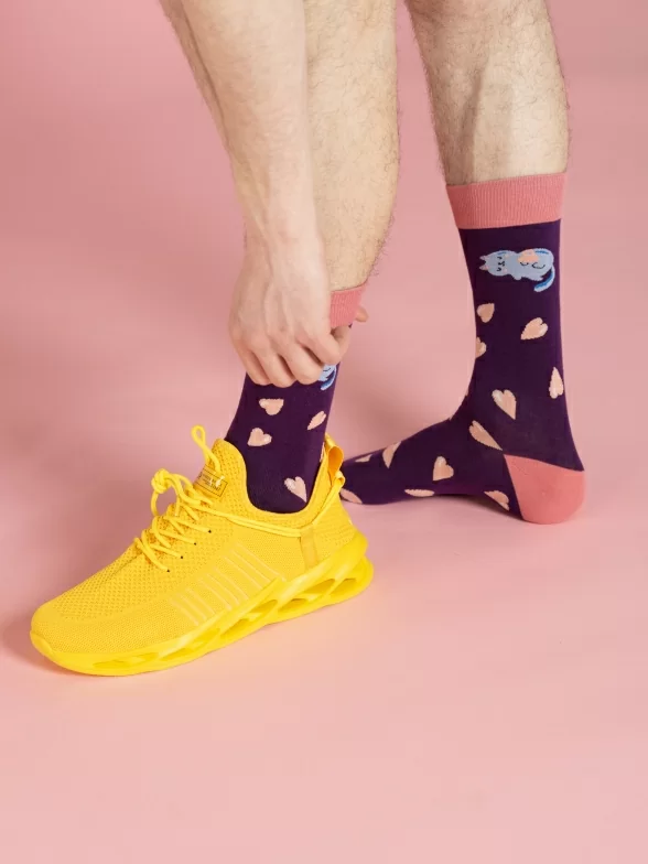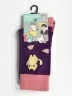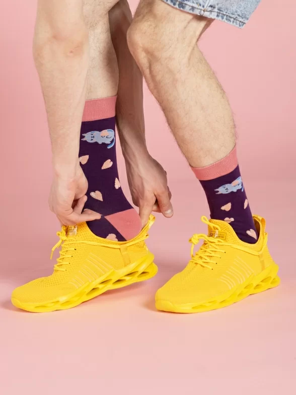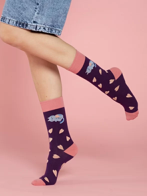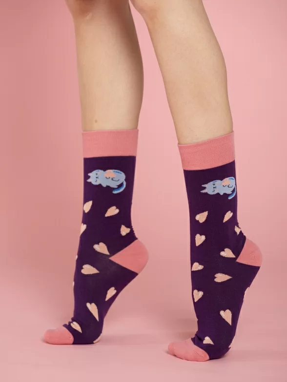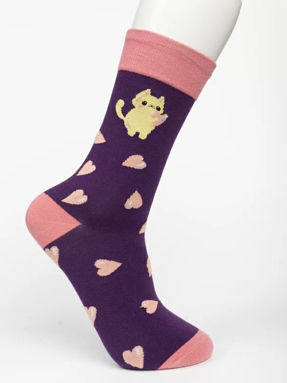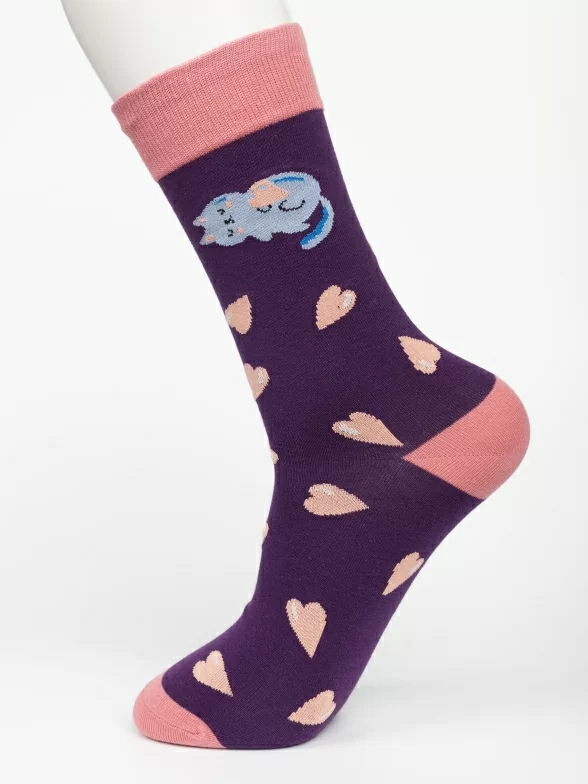Круглогодичные средней длины носки унисекс, цвет фиолетовый-розовый, с принтом, шов обычный (не бесшовные), принт (рисунок): контрастные пятка/мысок/резинка, животные, кот, сердечки, состав: 80% хлопок, 17% полиамид, 3% эластан, арт. PM412. Производитель «Oemen» Китай под брендом «Oemen».