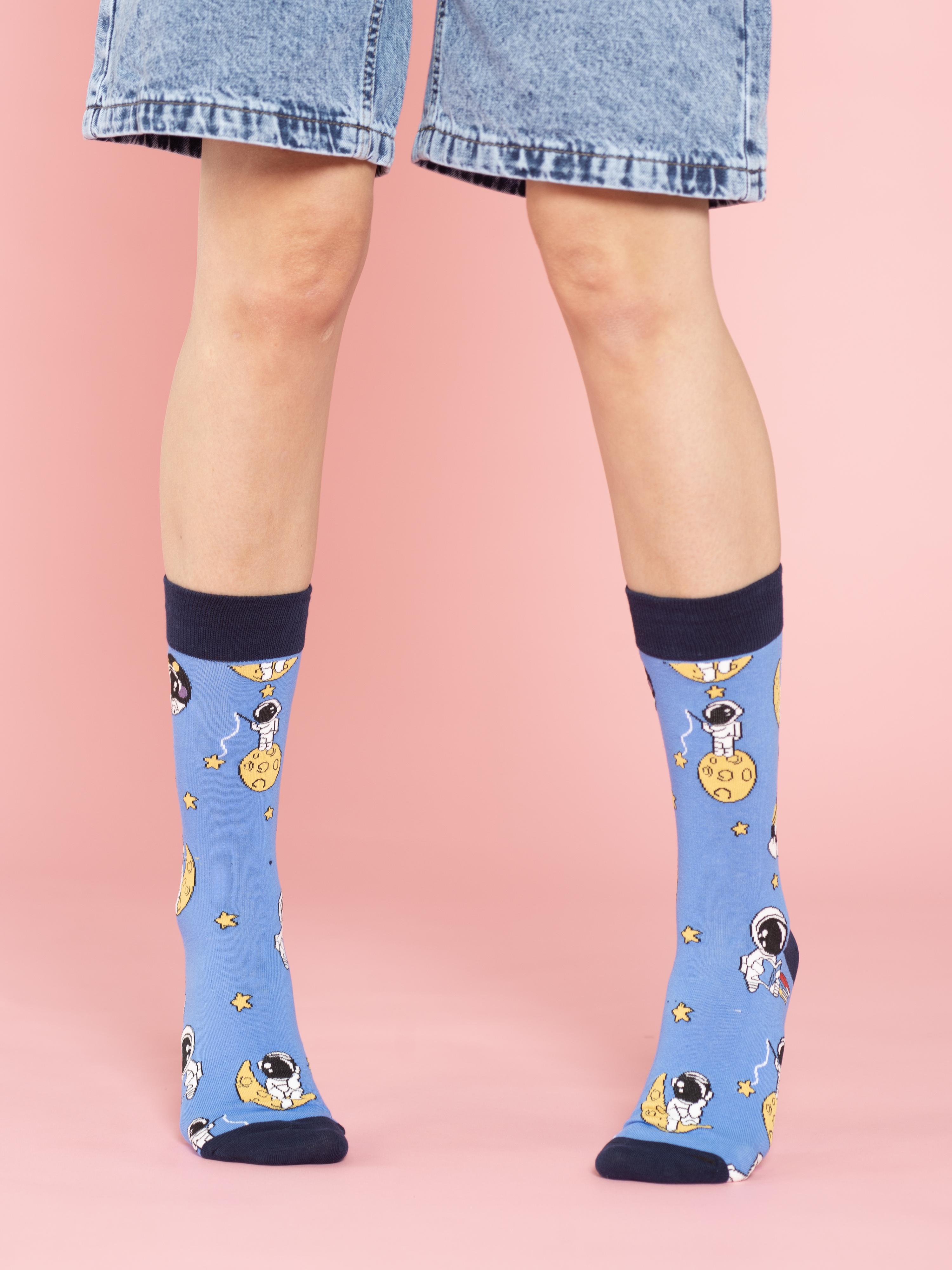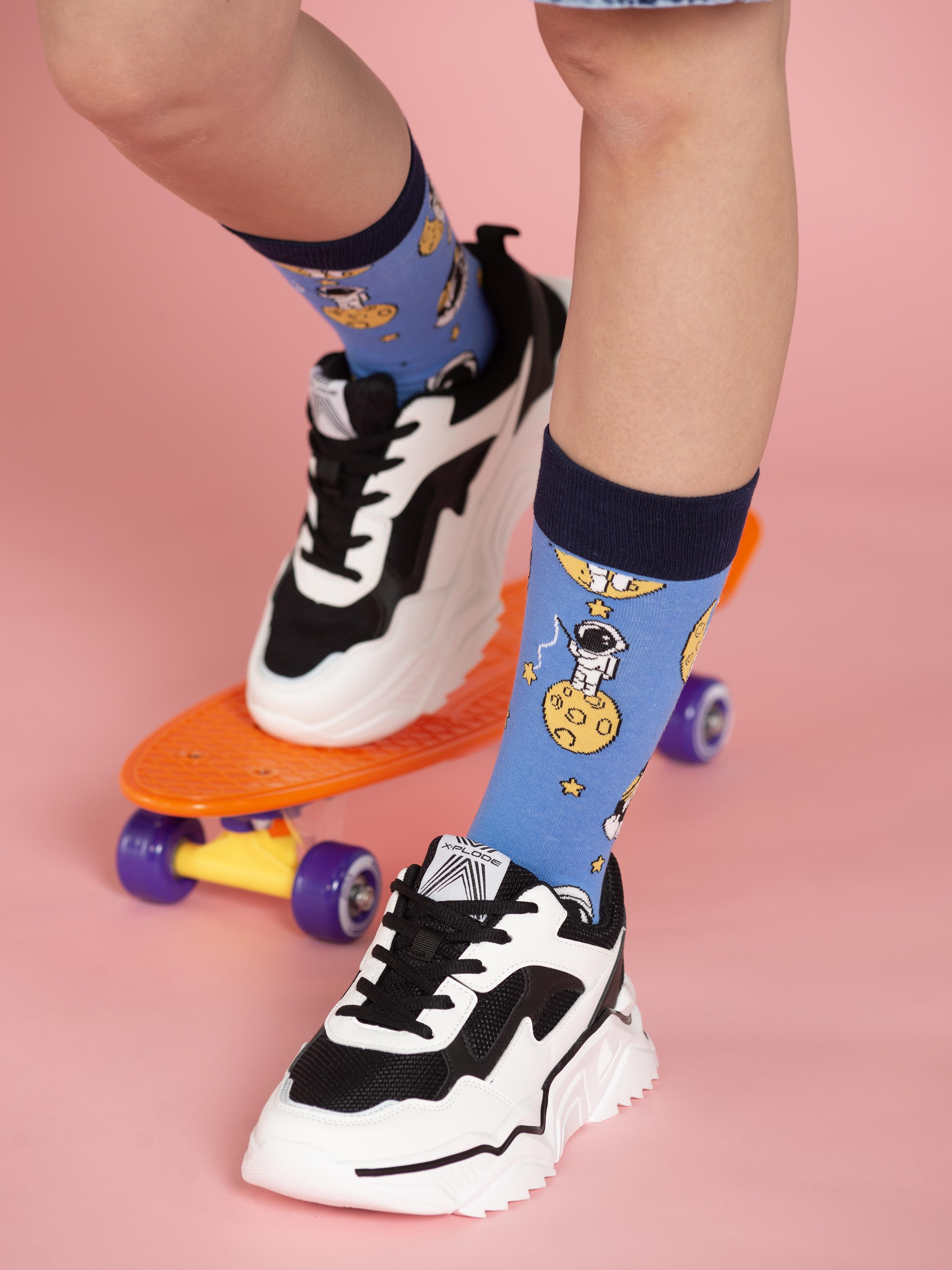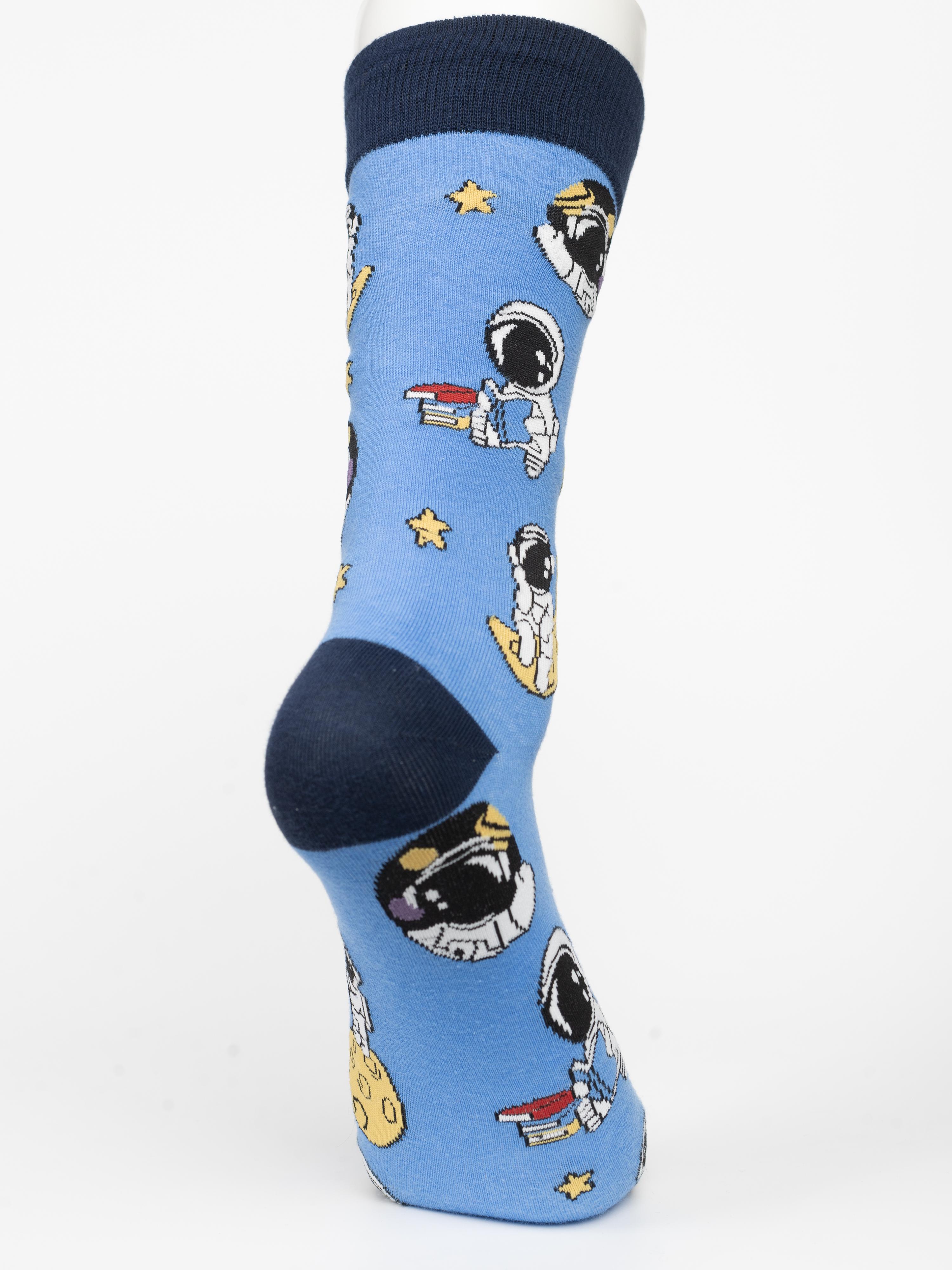 Круглогодичные средней длины носки унисекс, цвет синий,, принт (рисунок): космос, контрастные пятка/мысок/резинка, состав: 95% хлопок, 5% эластан, арт. PW707. Производитель «Oemen» Китай .