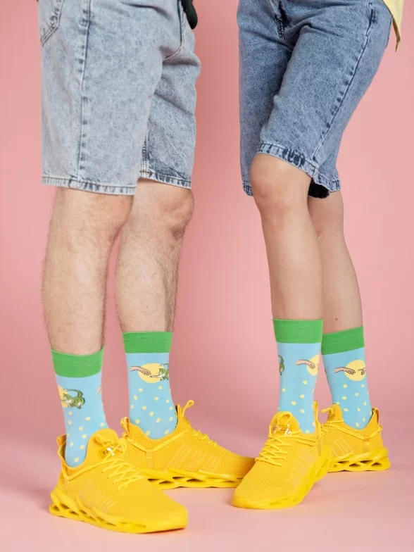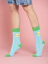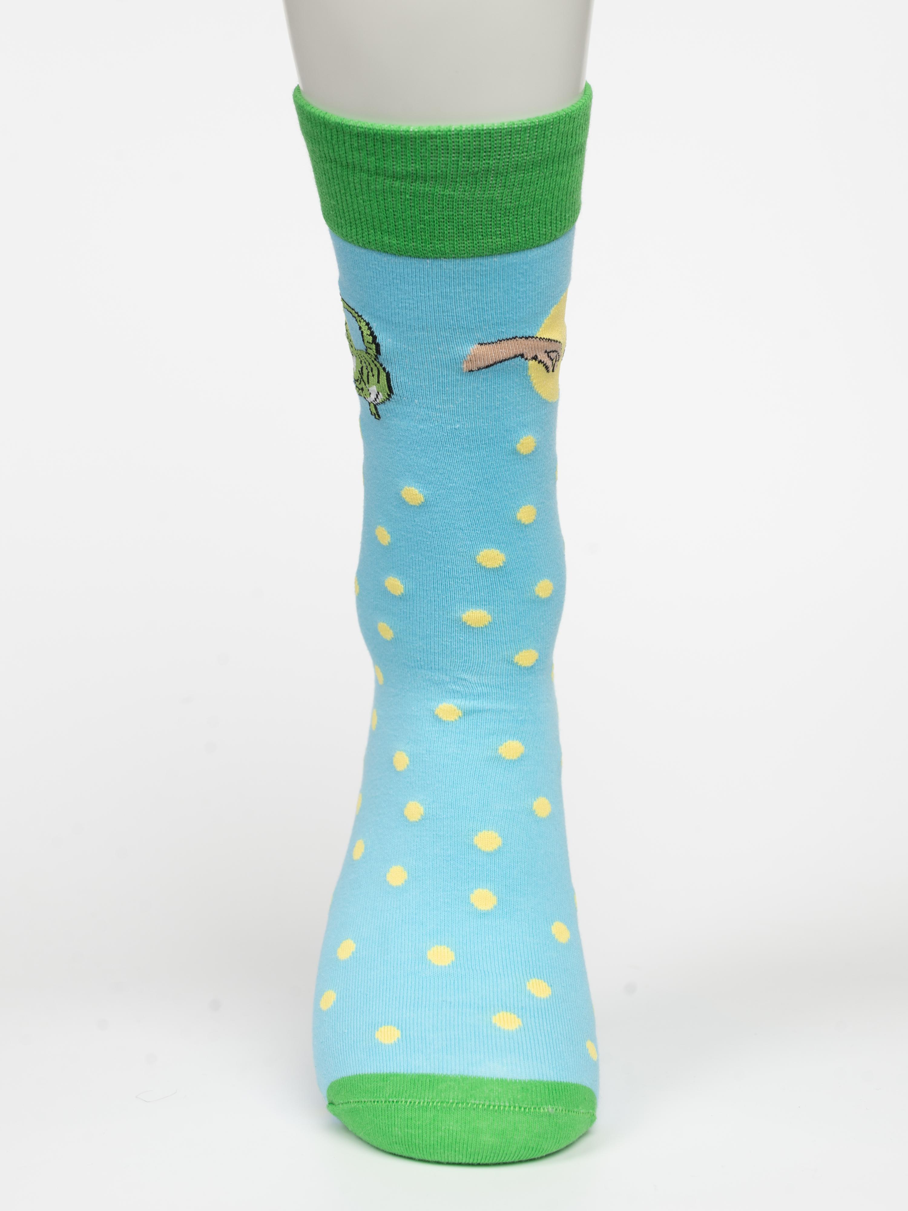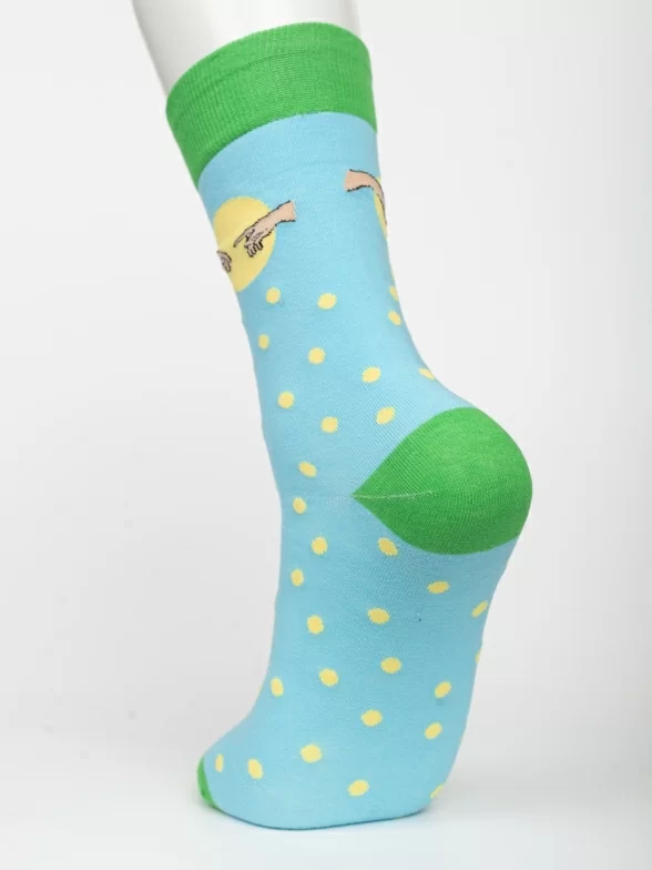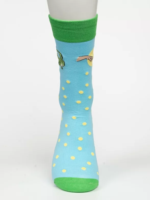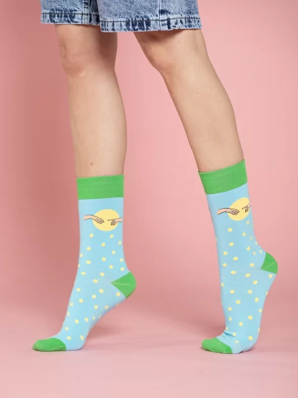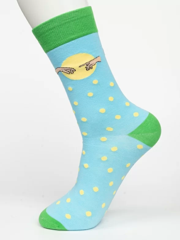 Круглогодичные средней длины носки унисекс, цвет голубой, с принтом, шов обычный (не бесшовные), принт (рисунок): произведения искусства, Сотворение мира, контрастные пятка/мысок/резинка, горох, состав: 95% хлопок, 5% эластан, арт. PW708. Производитель «Oemen» Китай под брендом «Oemen».