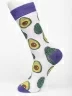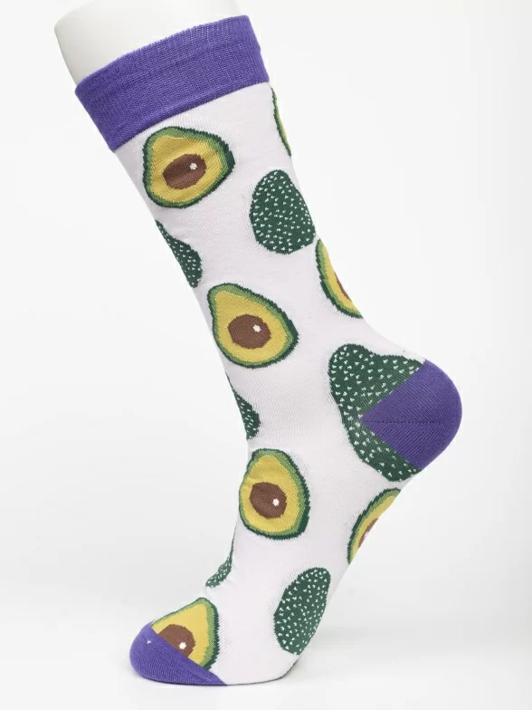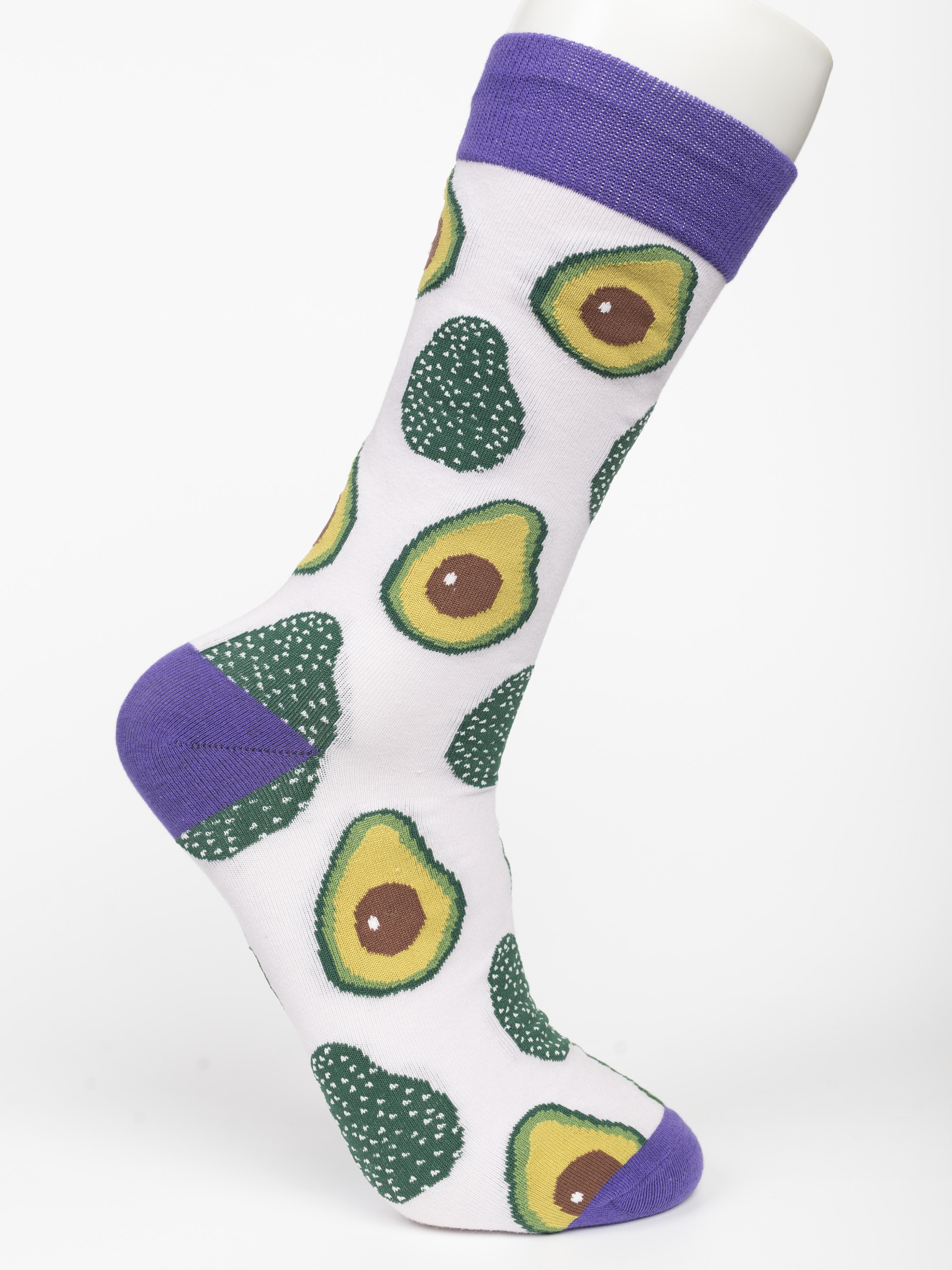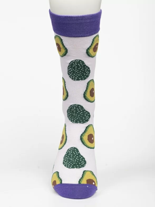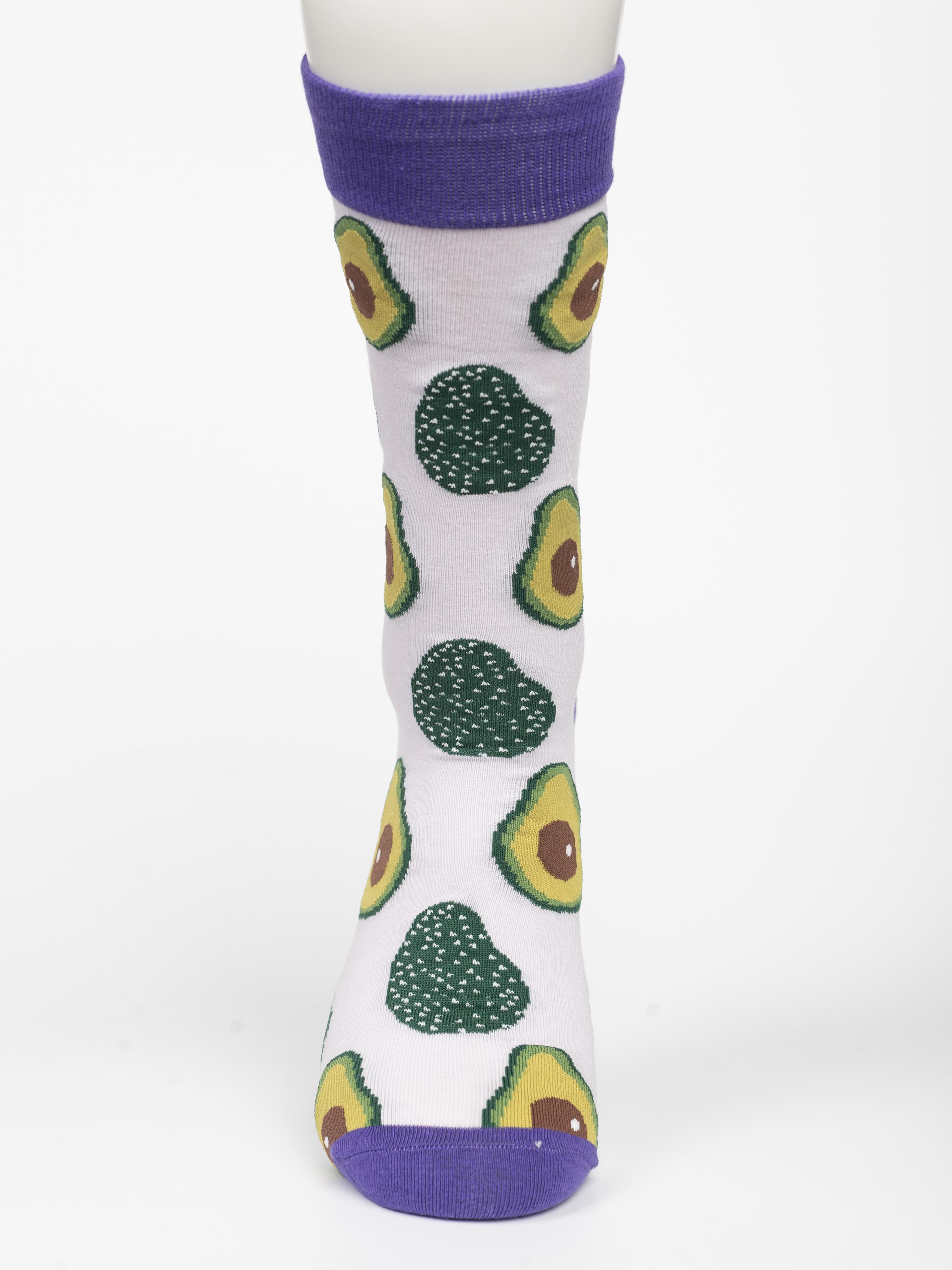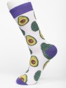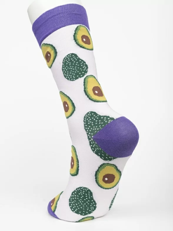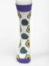 Круглогодичные средней длины носки унисекс, цвет фиолетовый-зеленый, с принтом, шов обычный (не бесшовные), принт (рисунок): фрукты, авокадо, контрастные пятка/мысок/резинка, состав: 95% хлопок, 5% эластан, арт. PW711. Производитель «Oemen» Китай под брендом «Oemen».