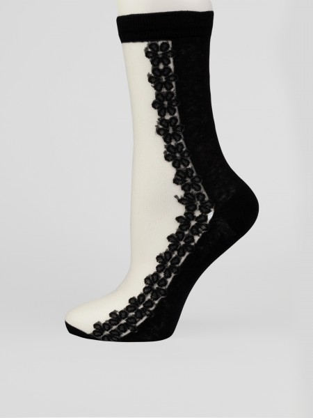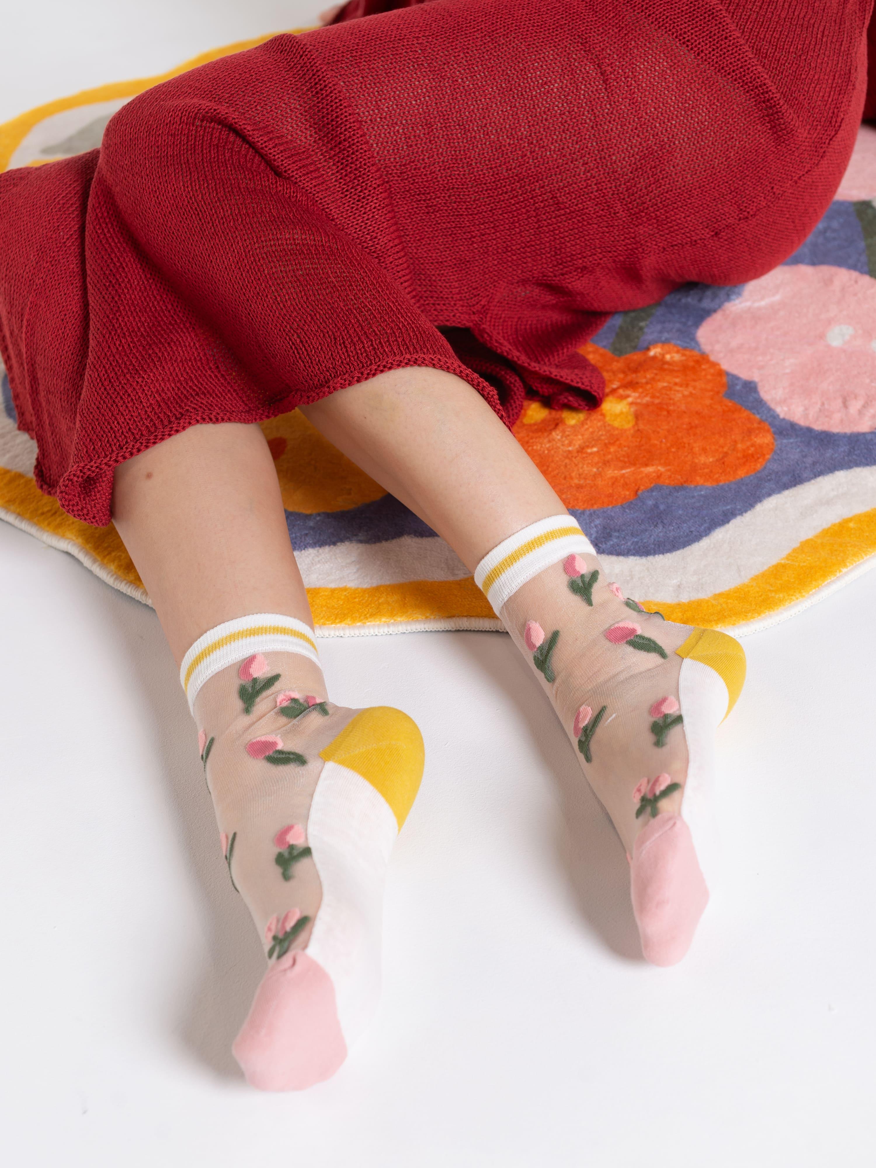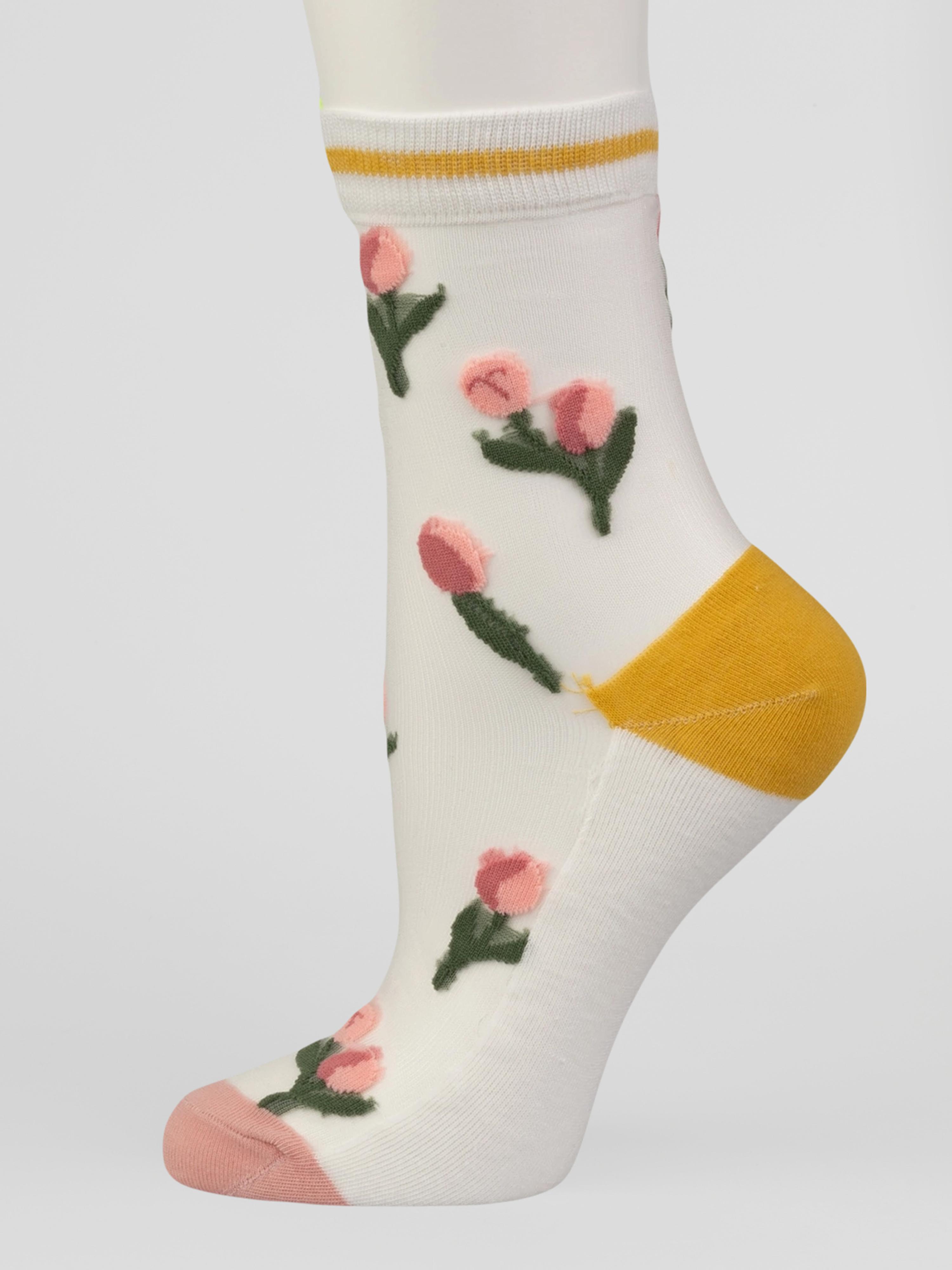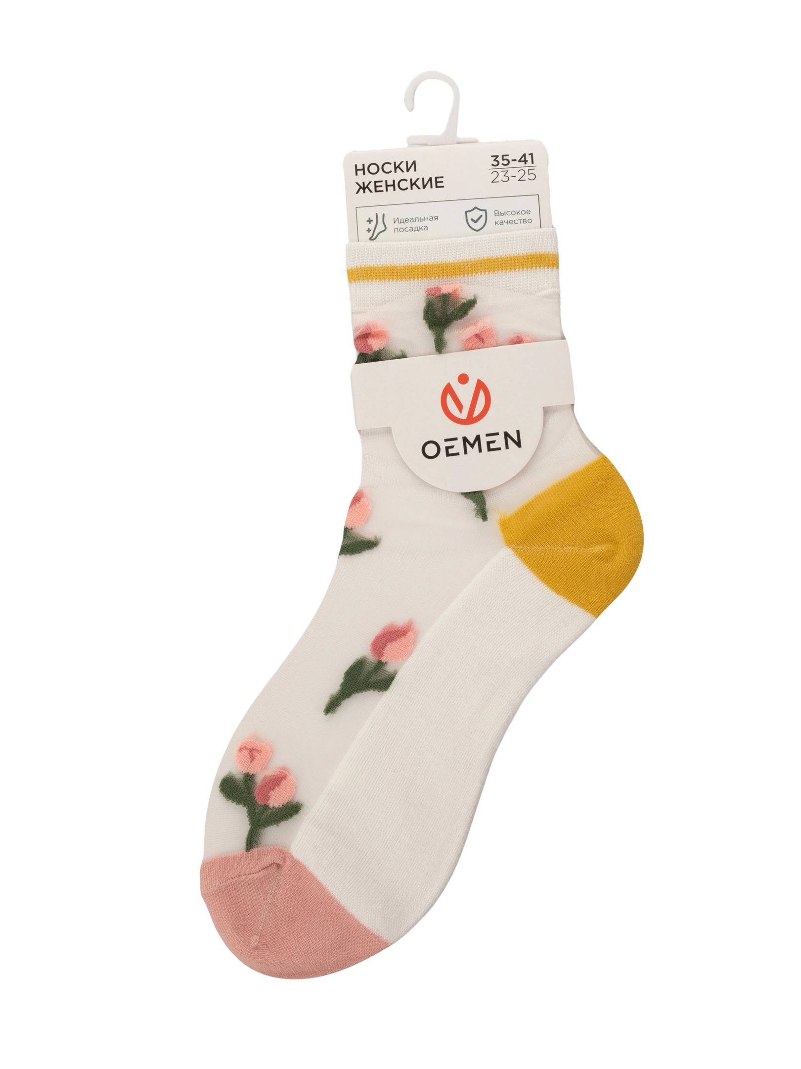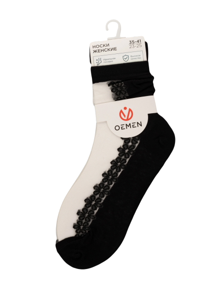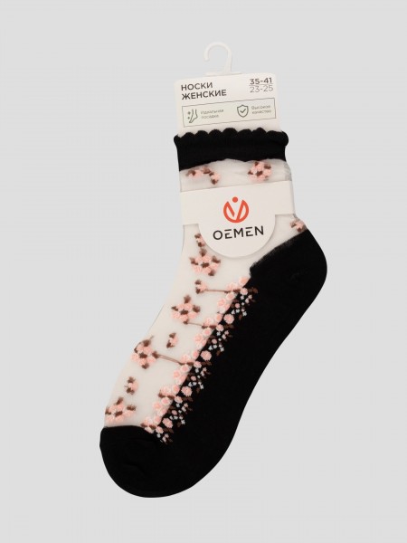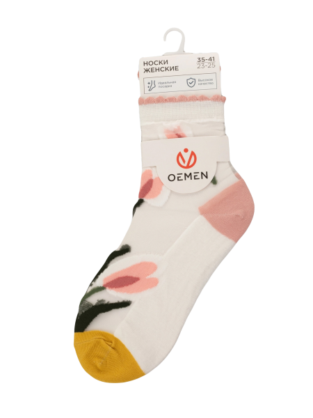 Летние средней длины женские носки, цвет бежевый, ажурные, шов обычный (не бесшовные), принт (рисунок): цветы / растения, состав: 38.5% хлопок, 37.5% полиэстер, 21.7% нейлон, 2.3% эластан, арт. 1807. Производитель «Oemen» Китай под брендом «Oemen».