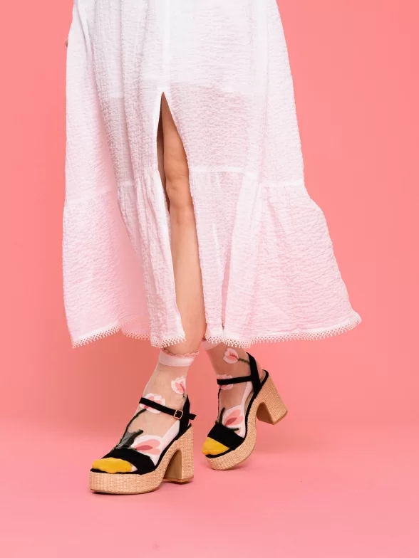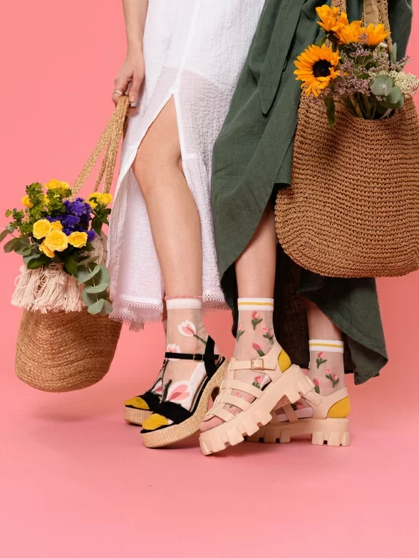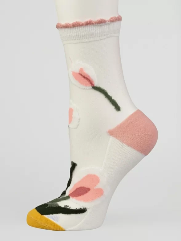 Летние средней длины женские носки, цвет бежевый, ажурные, шов обычный (не бесшовные), принт (рисунок): цветы / растения, состав: 38.5% хлопок, 37.5% полиэстер, 21.7% нейлон, 2.3% эластан, арт. 1808. Производитель «Oemen» Китай под брендом «Oemen».