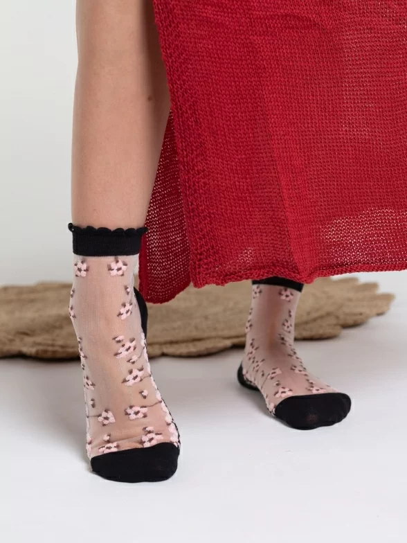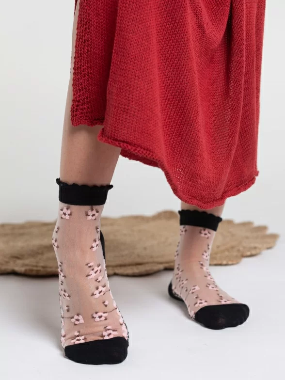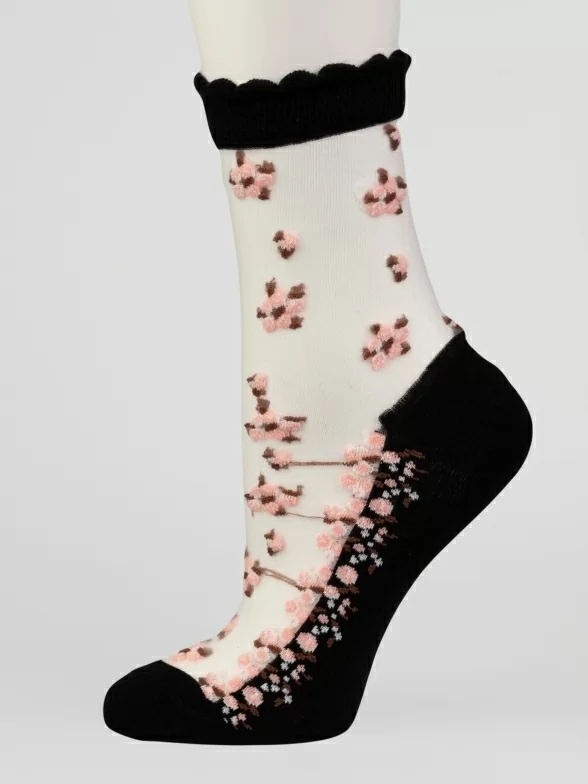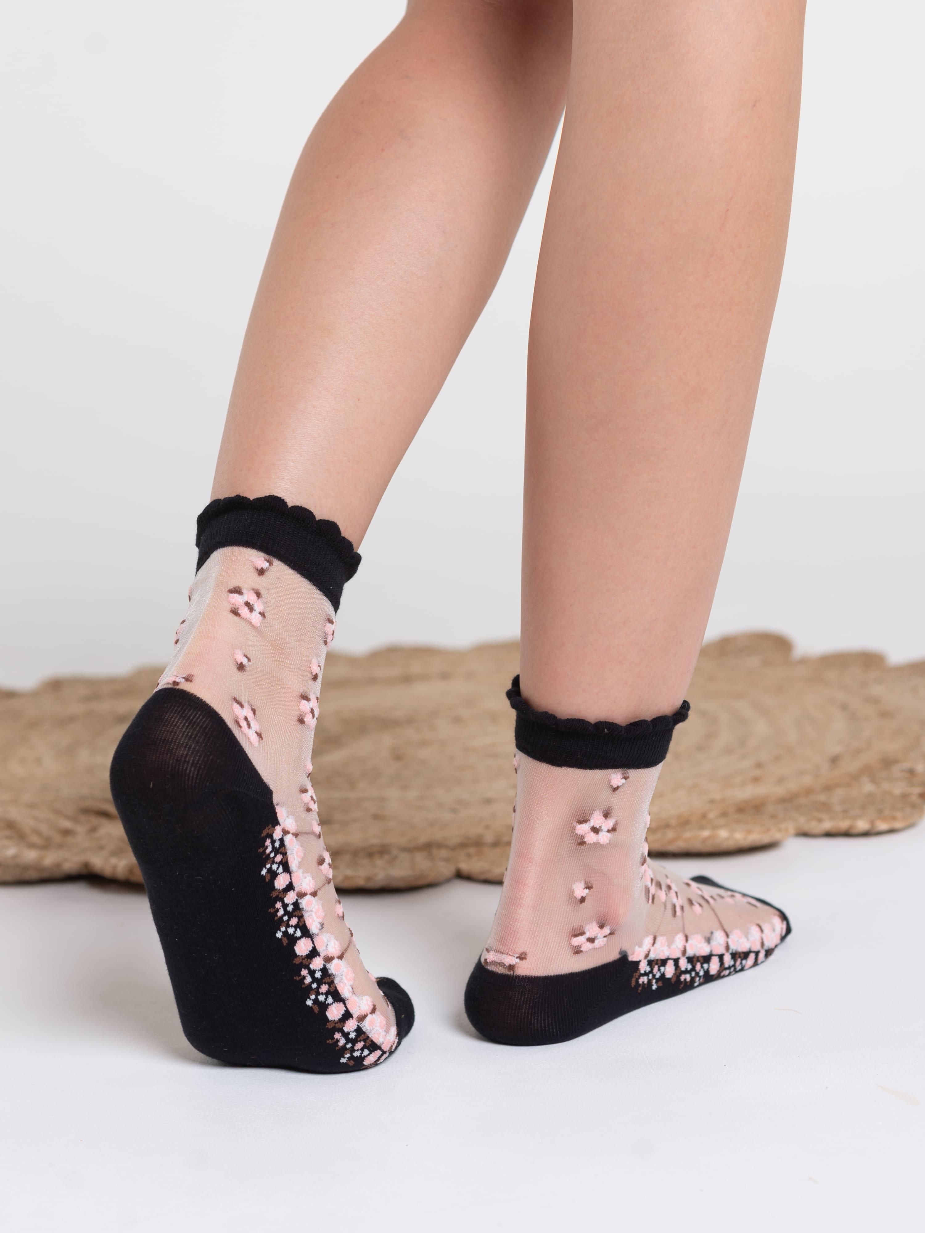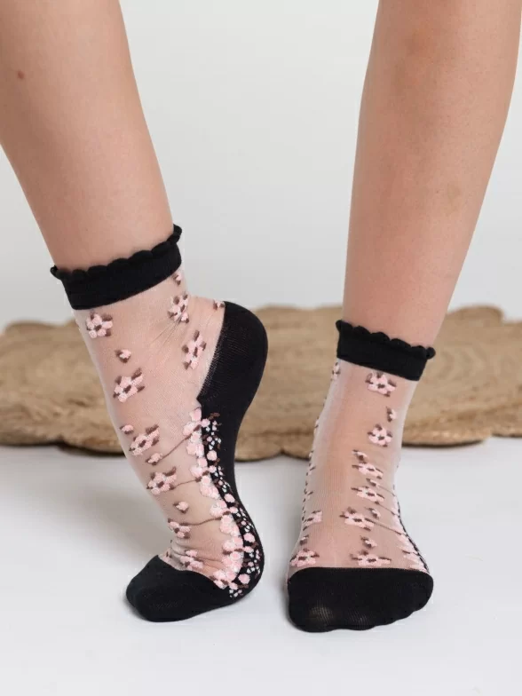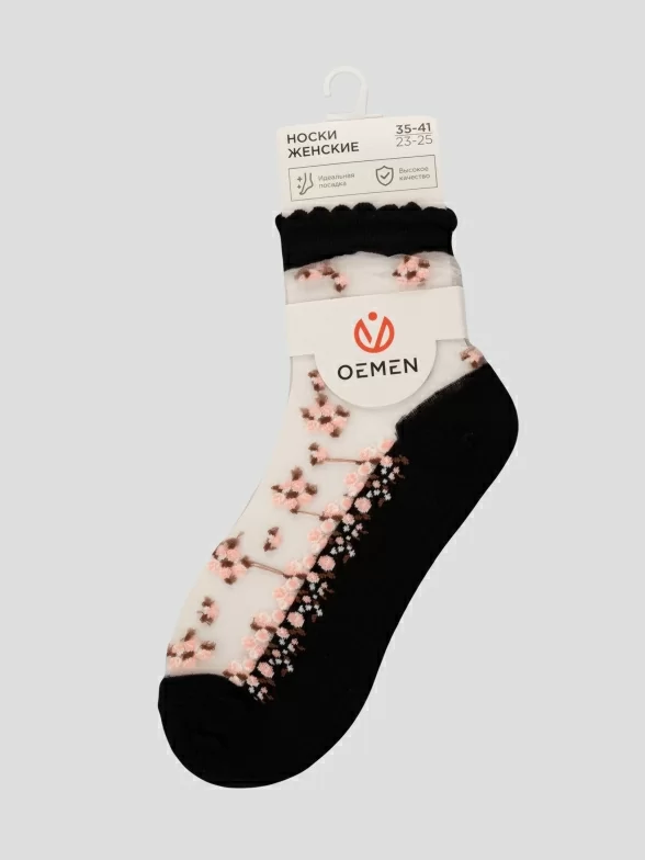 Летние средней длины женские носки, цвет черный, ажурные, шов обычный (не бесшовные), принт (рисунок): цветы / растения, состав: 38.5% хлопок, 37.5% полиэстер, 21.7% нейлон, 2.3% эластан, арт. 1806. Производитель «Oemen» Китай под брендом «Oemen».