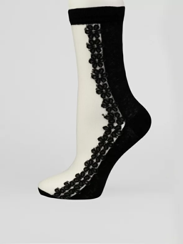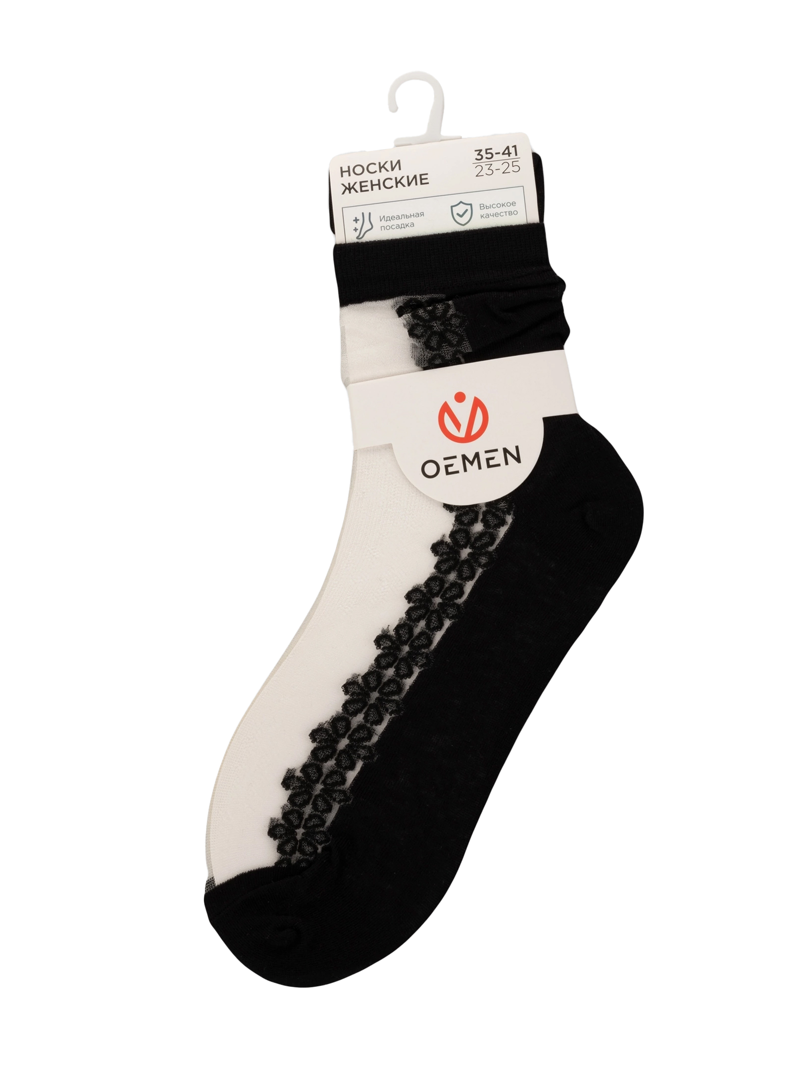Летние средней длины женские носки, цвет черный, ажурные, шов обычный (не бесшовные), принт (рисунок): цветы / растения, состав: 38.5% хлопок, 37.5% полиэстер, 21.7% нейлон, 2.3% эластан, арт. 1809. Производитель «Oemen» Китай под брендом «Oemen».