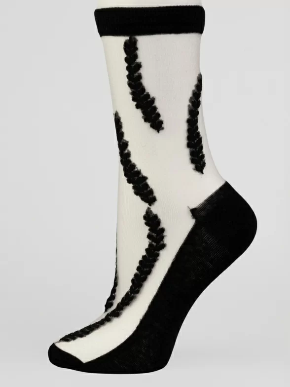 Летние средней длины женские носки, цвет черный, ажурные, шов обычный (не бесшовные), принт (рисунок): цветы / растения, состав: 38.5% хлопок, 37.5% полиэстер, 21.7% нейлон, 2.3% эластан, арт. 1810. Производитель «Oemen» Китай под брендом «Oemen».