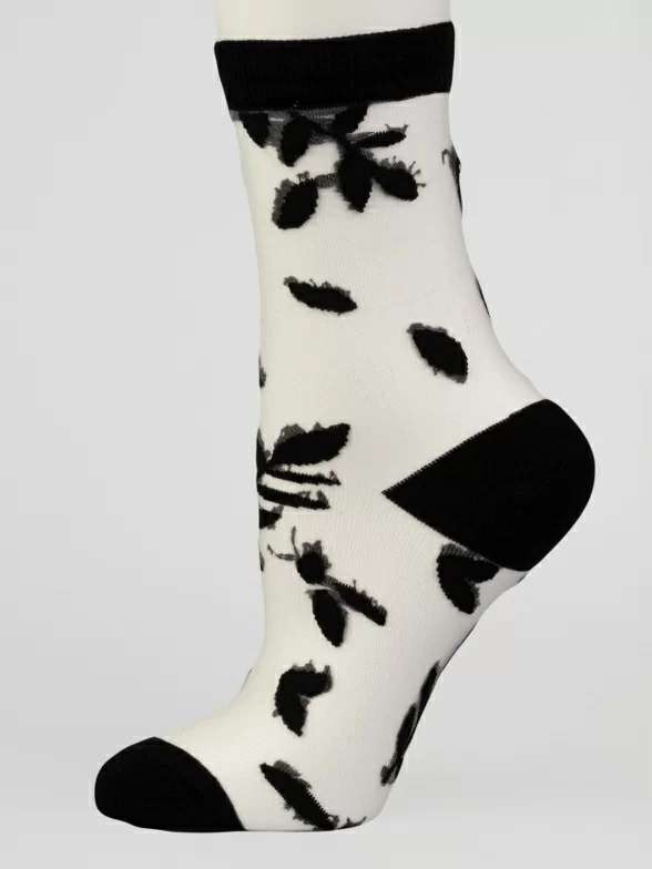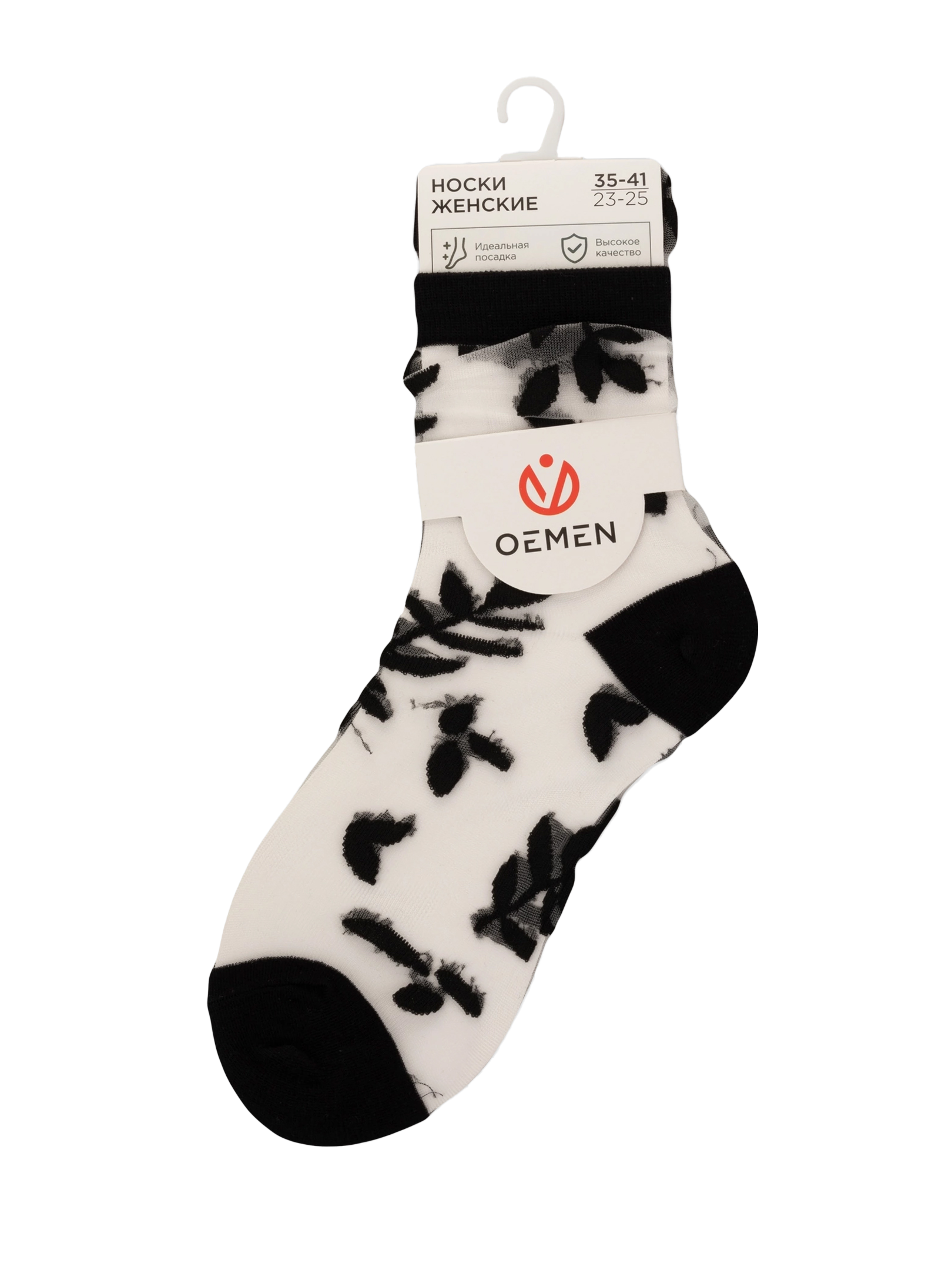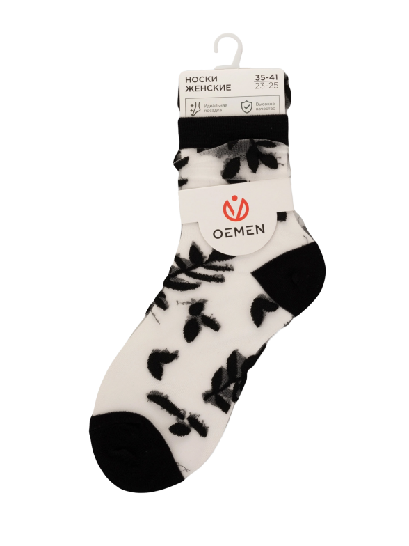 Летние средней длины женские носки, цвет черный, ажурные, шов обычный (не бесшовные), принт (рисунок): цветы / растения, состав: 38.5% хлопок, 37.5% полиэстер, 21.7% нейлон, 2.3% эластан, арт. 1811. Производитель «Oemen» Китай под брендом «Oemen».