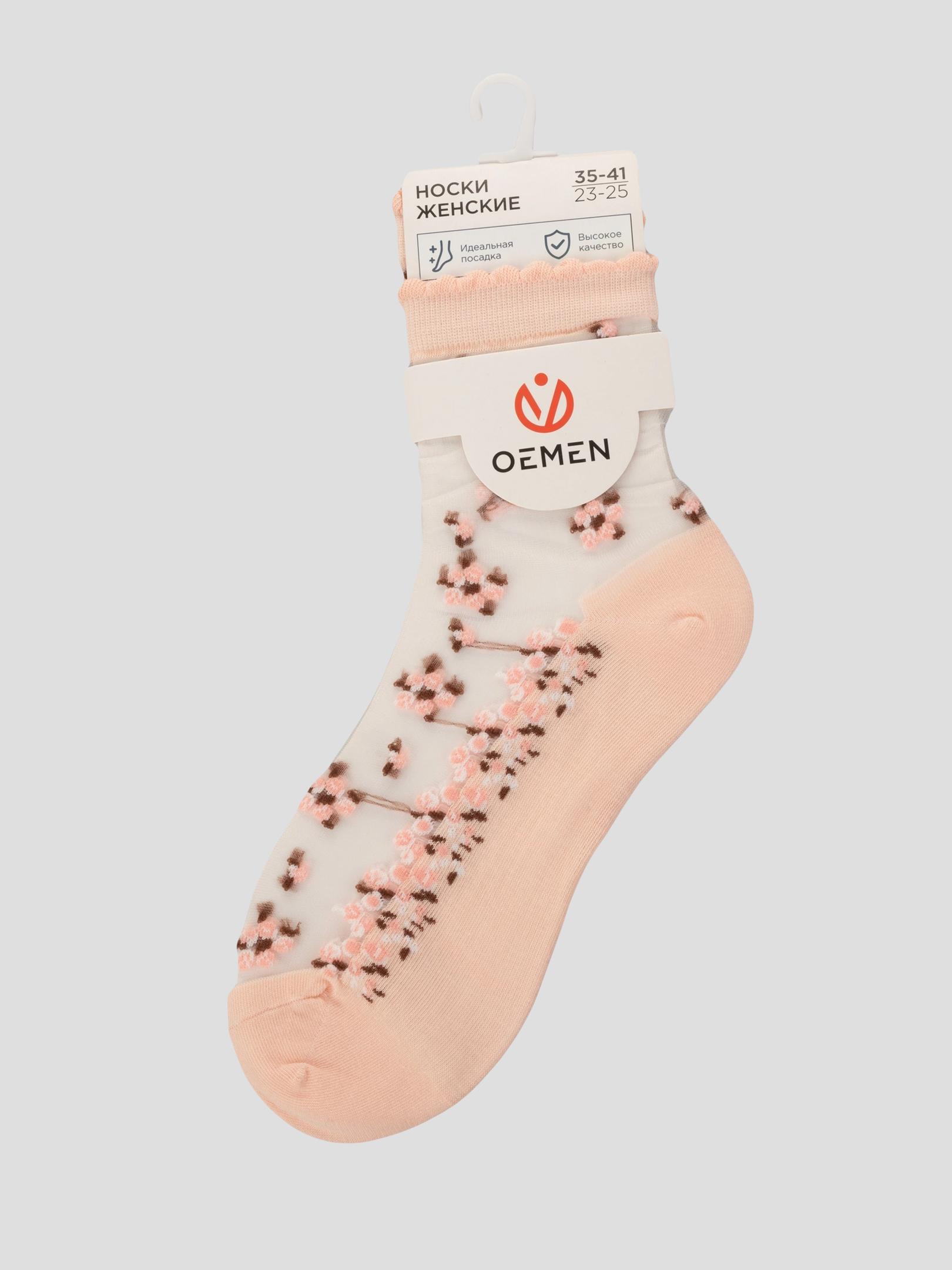 Летние средней длины женские носки, цвет розовый, ажурные, шов обычный (не бесшовные), принт (рисунок): цветы / растения, состав: 38.5% хлопок, 37.5% полиэстер, 21.7% нейлон, 2.3% эластан, арт. 1813. Производитель «Oemen» Китай под брендом «Oemen».