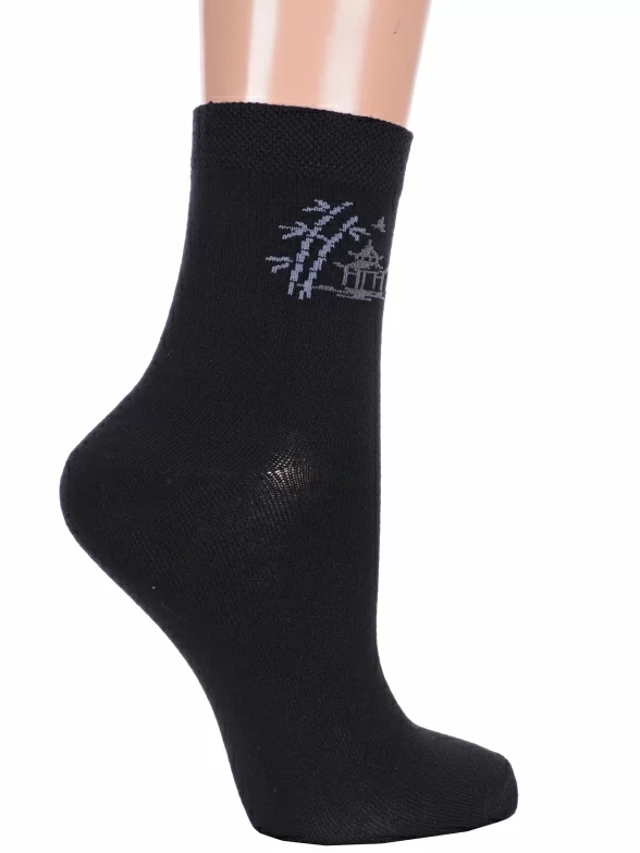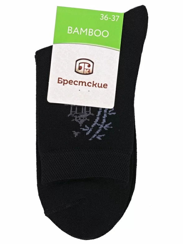 Межсезонные или летние укороченные женские носки, цвет черный, повседневные, шов обычный (не бесшовные), принт (рисунок): с узором, состав: 70% бамбук, 24% полиэстер, 4% полиамид, 2% эластан, арт. 21C1503. Производитель «Брестский чулочный комбинат ОАО, Беларусь» под брендом «Брестские (бчк)».