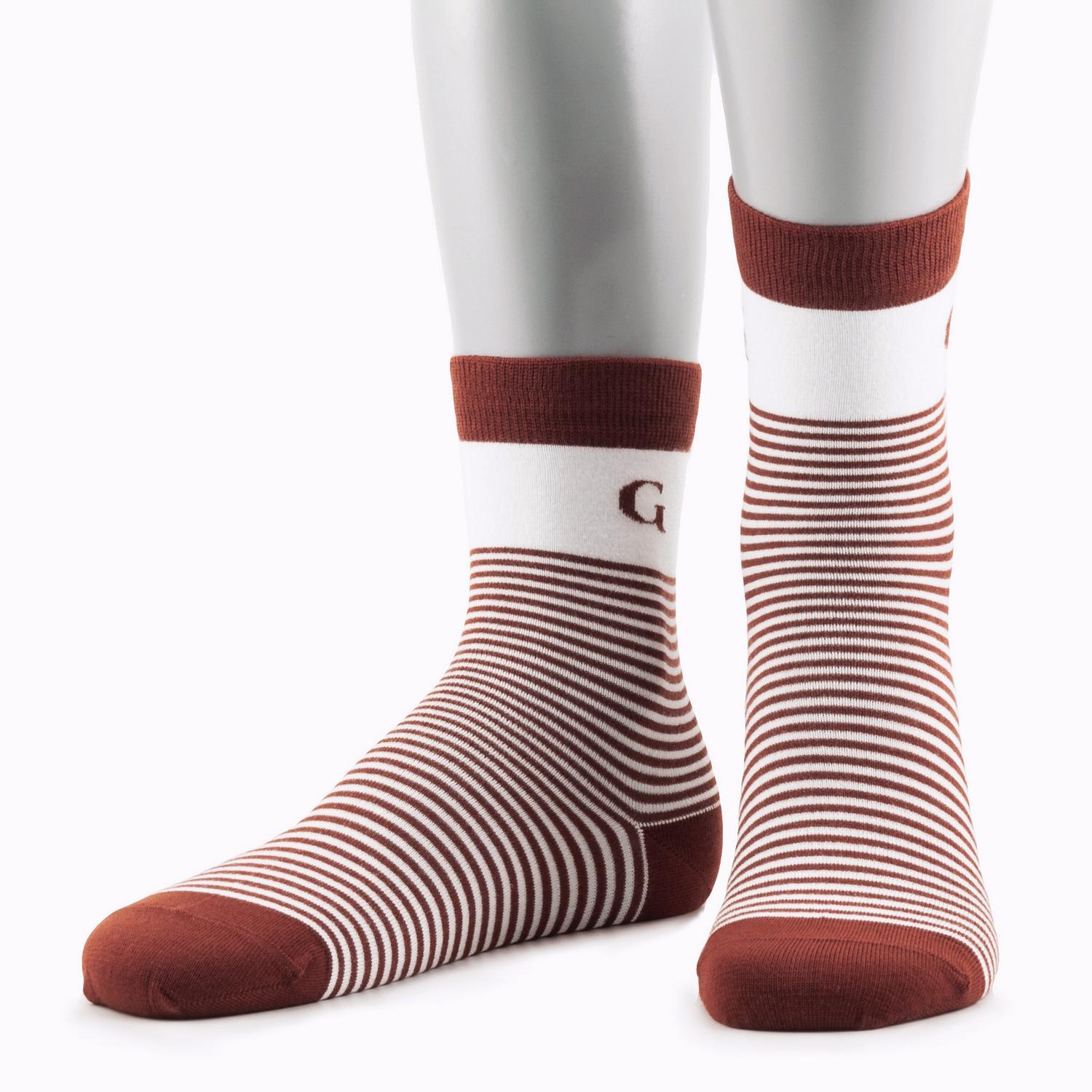 Слегка укороченная модель в полоску с двойным бортом (манжетом резинки) и плоским малоощутимым швом на мыске.