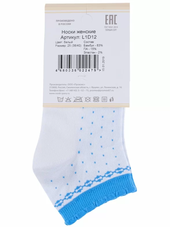 Летние короткие женские носки, цвет белый, классические, шов обычный (не бесшовные), принт (рисунок): горох / точка, состав: 83% бамбук, 15% полиамид, 2% эластан, арт. L1D12. Производитель «ПРОМЭКС ООО, Смоленская область, Россия» под брендом «Para socks».