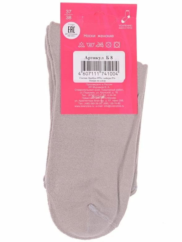 Межсезонные укороченные женские носки, цвет серый, с махровым следом, классические, шов кеттельный (бесшовная технология), принт (рисунок): однотонный, без рисунков/узоров, состав: 95% бамбук, 5% лайкра, арт. Б8. Производитель «ИП Мурзаков В.А., Ставропольский край, Россия» под брендом «Lorenzline».