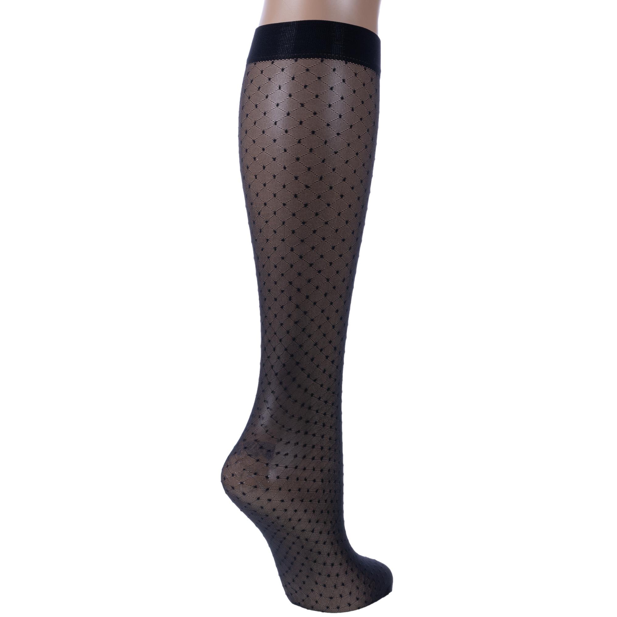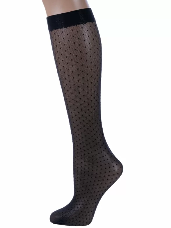 Женские однотонные гольфы украшены геометрическим узором в клетку и горошек.