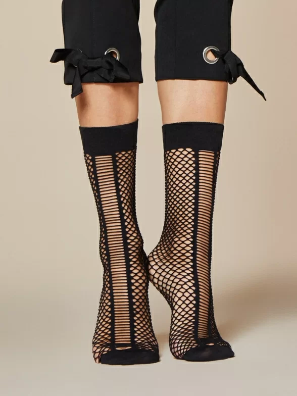 Эффектные гольфы из сетки с различной структурой плетения. Резинка и мысок – однотонные, матовые. Модель смотрится броско и необычно и позволит дополнить множество нарядов до незабываемого образа.