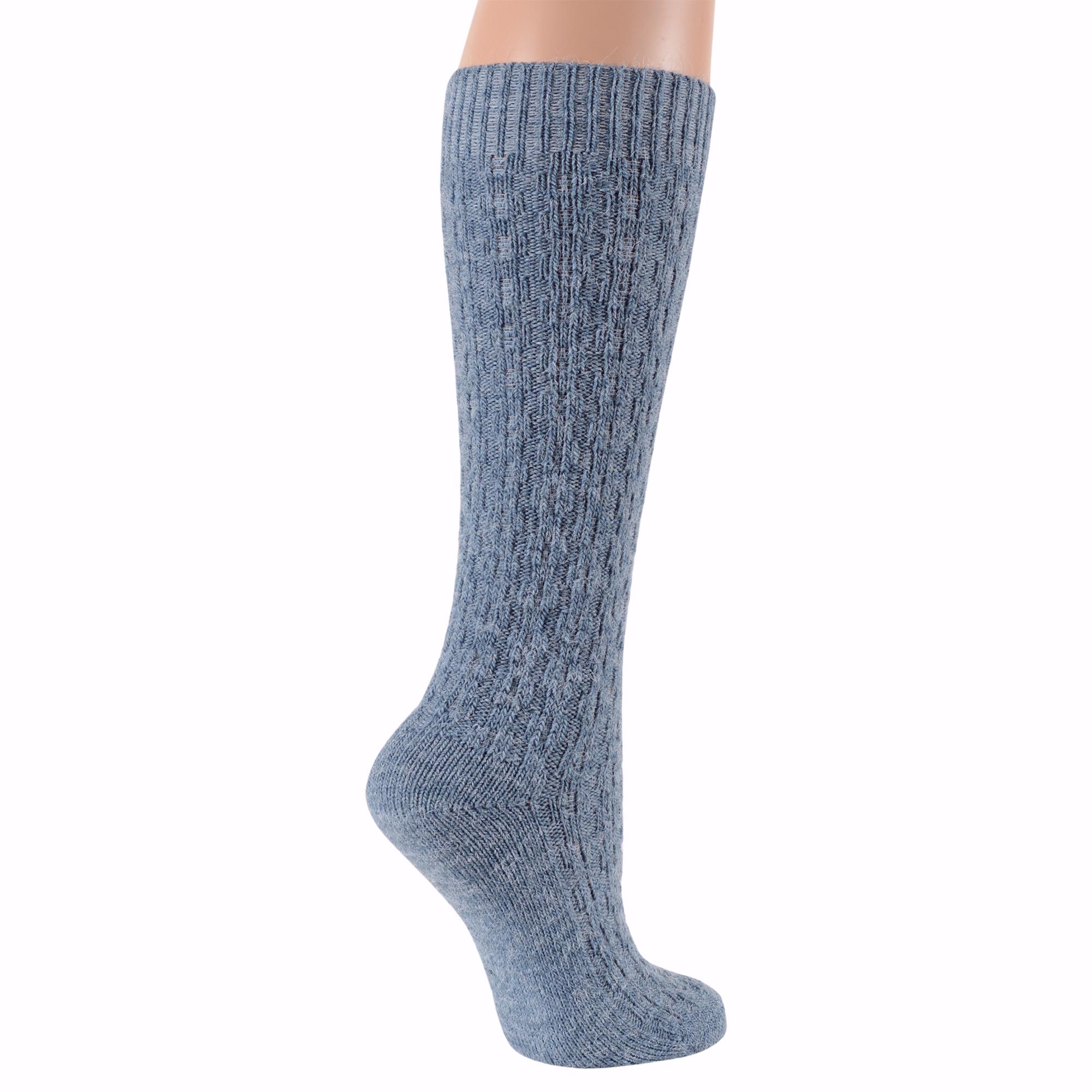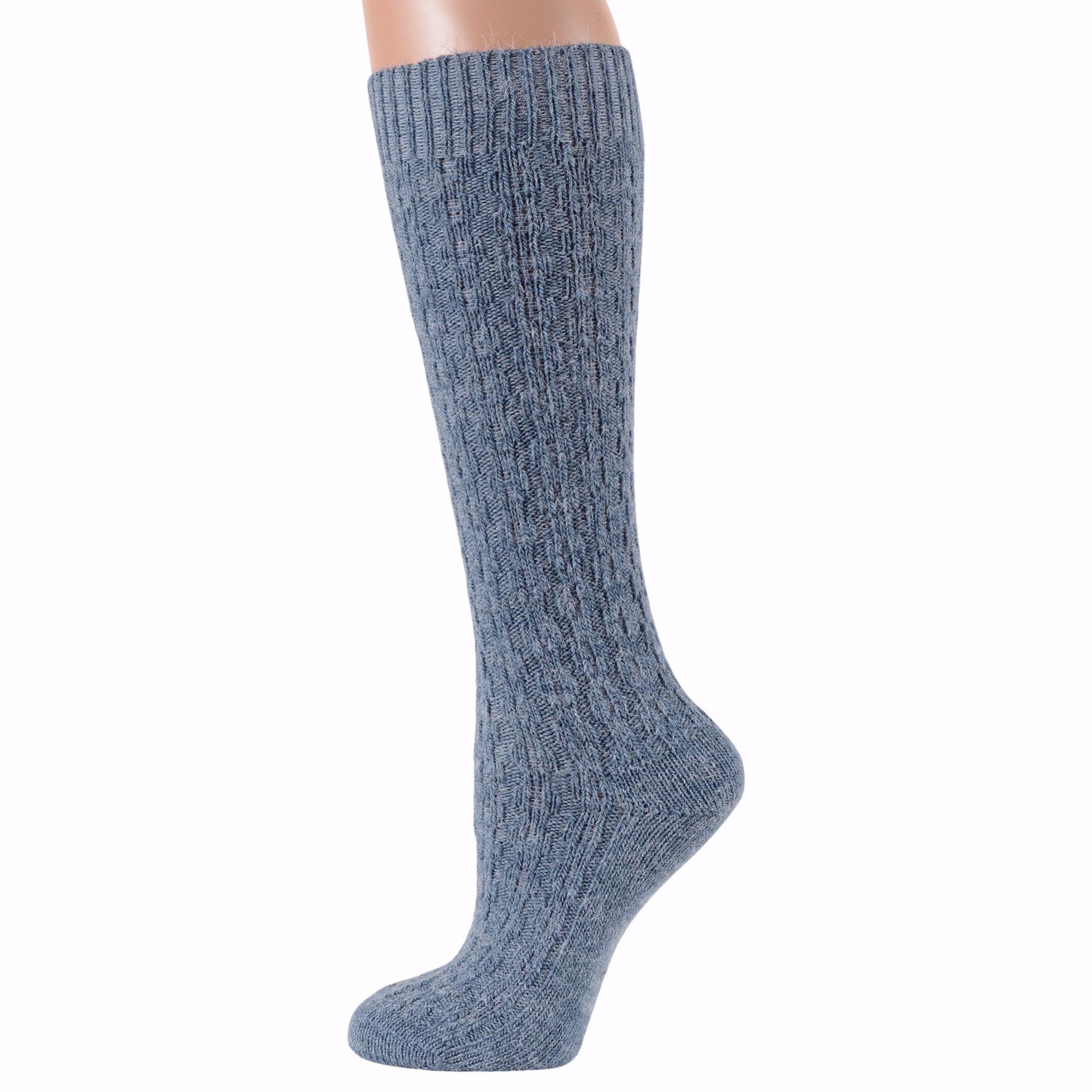 Женские теплые гольфы бренда "RuSocks" крупной вязки, имитирующей ручную, украшены фактурным геометрическим орнаментом.