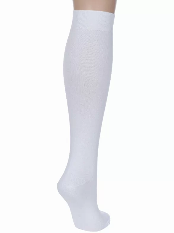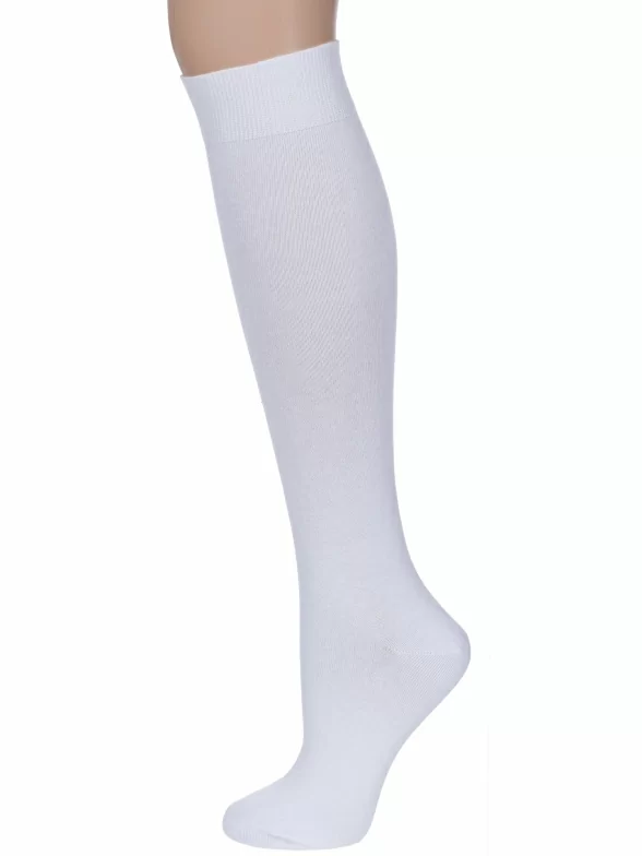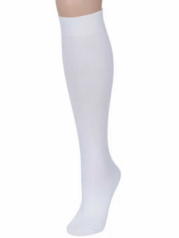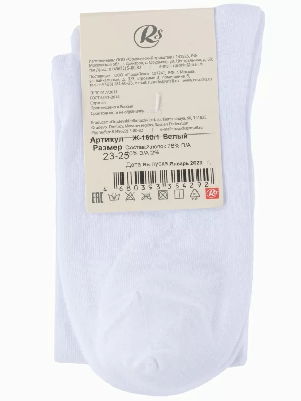Круглогодичные или зимние женские гольфы, цвет белый, классические, шов кеттельный (бесшовная технология), принт (рисунок): однотонный, без рисунков/узоров, состав: 78% хлопок, 20% полиамид, 2% эластан, арт. Ж-160/1. Производитель «ООО Орудьевский трикотаж, Россия» под брендом «Rusocks (орудьевский трикотаж)».