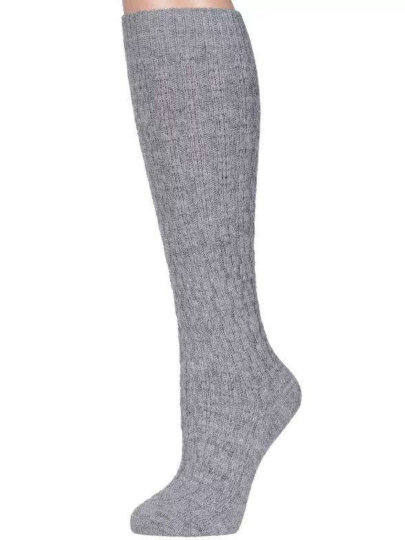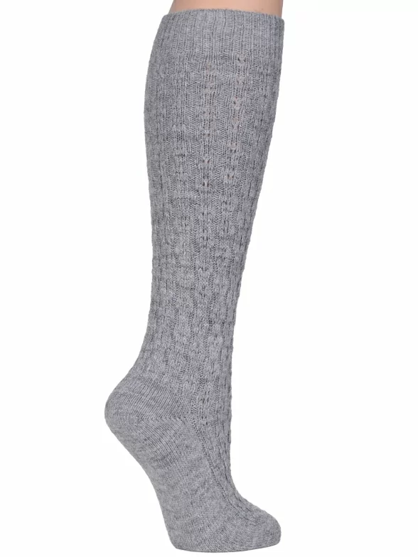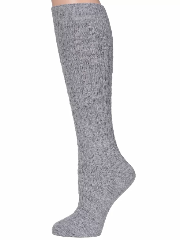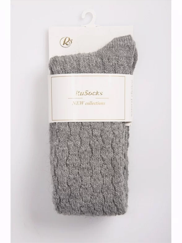 Женские теплые гольфы бренда "RuSocks" крупной вязки, имитирующей ручную, украшены фактурным геометрическим орнаментом.