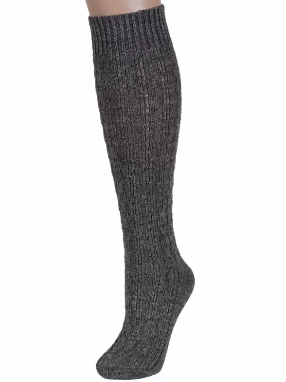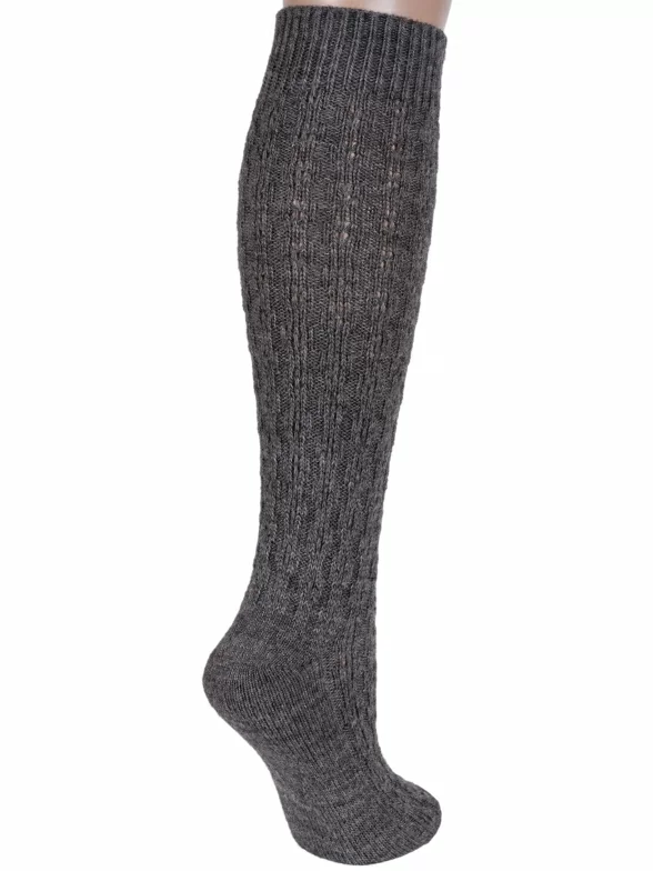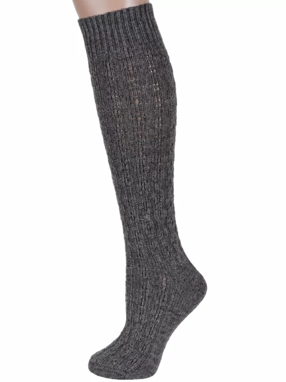 Женские теплые гольфы бренда "RuSocks" крупной вязки, имитирующей ручную, украшены фактурным геометрическим орнаментом.