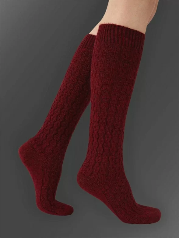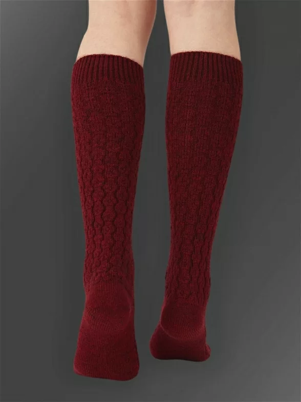 Женские теплые гольфы бренда "RuSocks" крупной вязки, имитирующей ручную, украшены фактурным геометрическим орнаментом.
