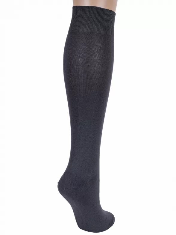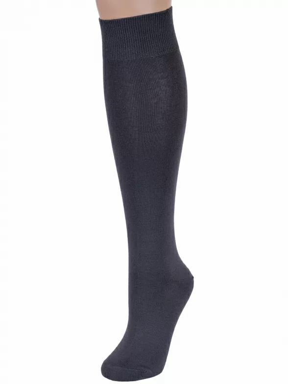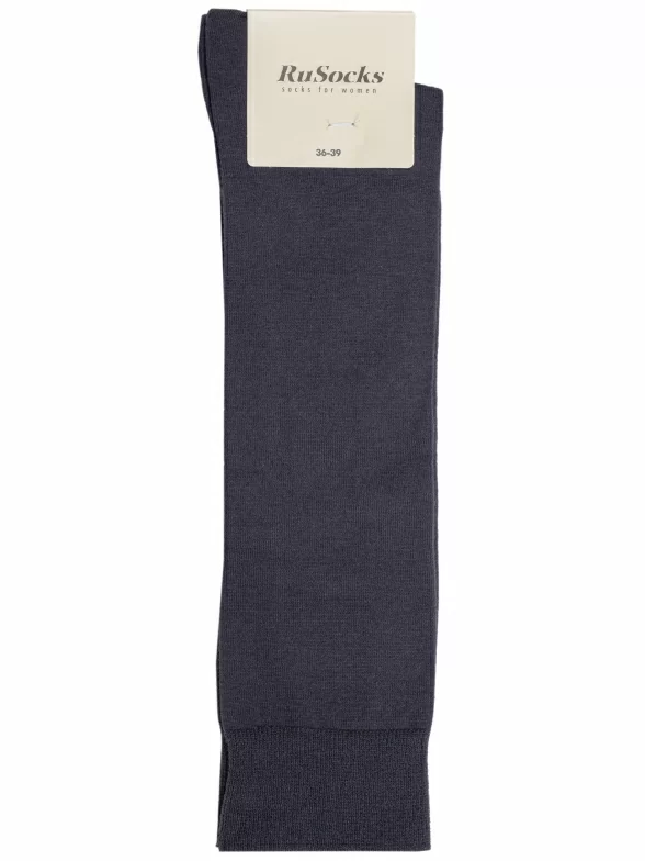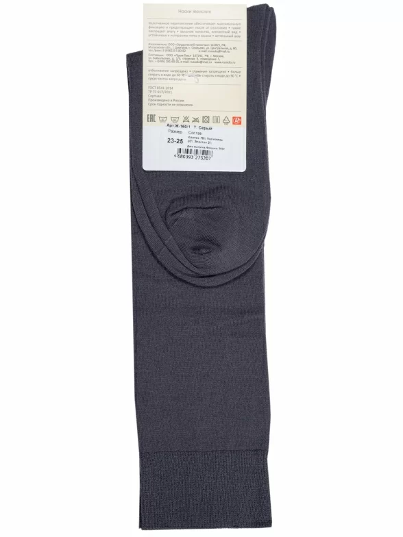 Круглогодичные или зимние женские гольфы, цвет темно-серый, классические, шов кеттельный (бесшовная технология), принт (рисунок): однотонный, без рисунков/узоров, состав: 78% хлопок, 20% полиамид, 2% эластан, арт. Ж-160/1. Производитель «ООО Орудьевский трикотаж, Россия» под брендом «Rusocks (орудьевский трикотаж)».