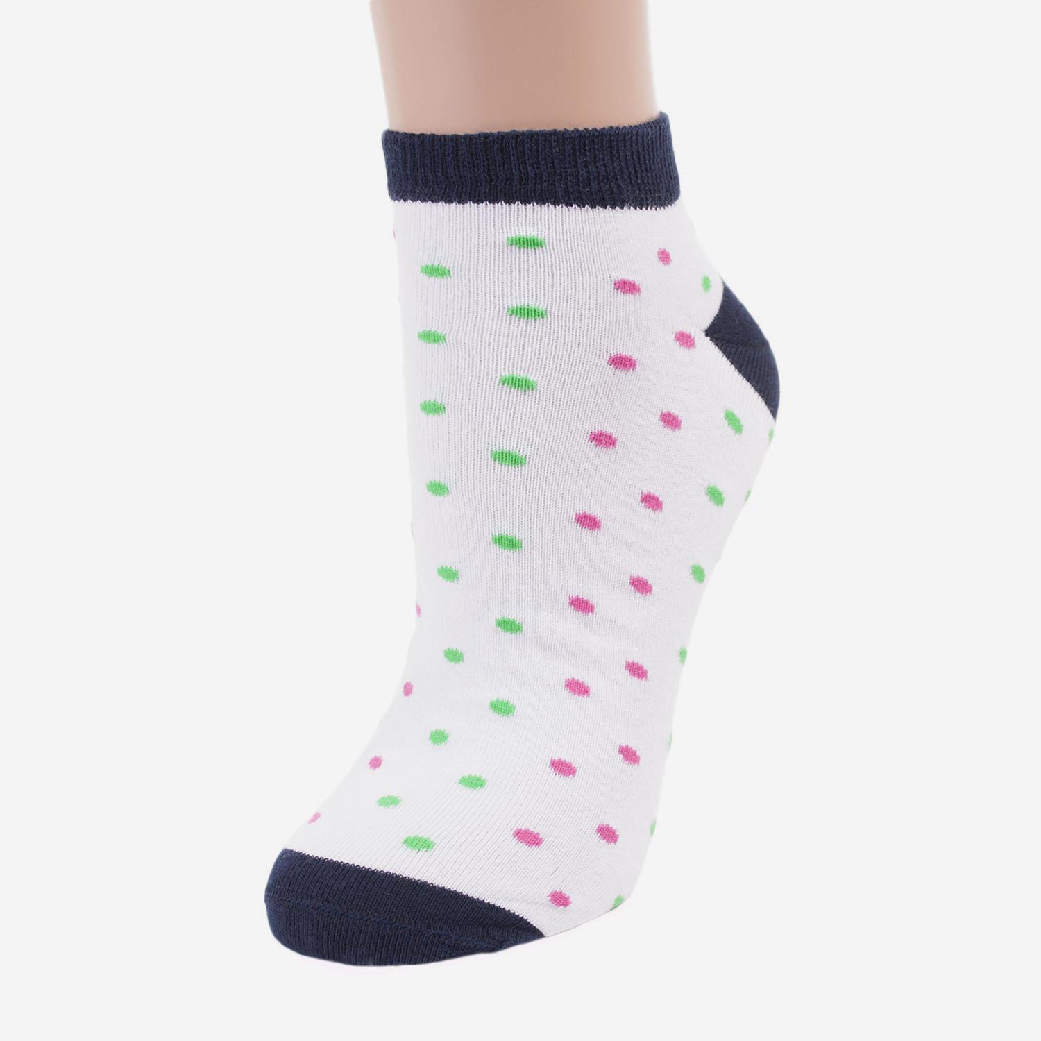 Укороченные женские носки из качественного трикотажа на основе хлопка. Модель декорирована цветным горохом и контрастными элементами: мыском, резинкой и пяткой.