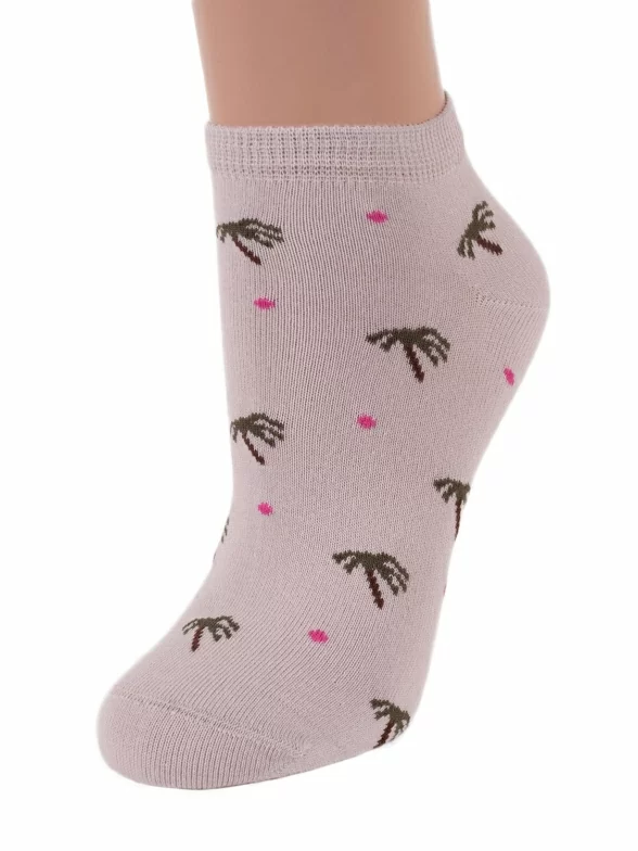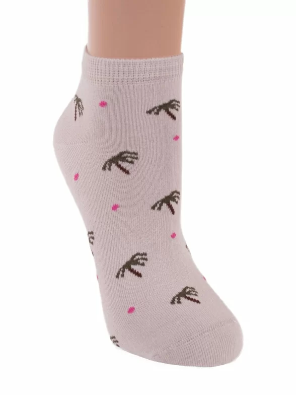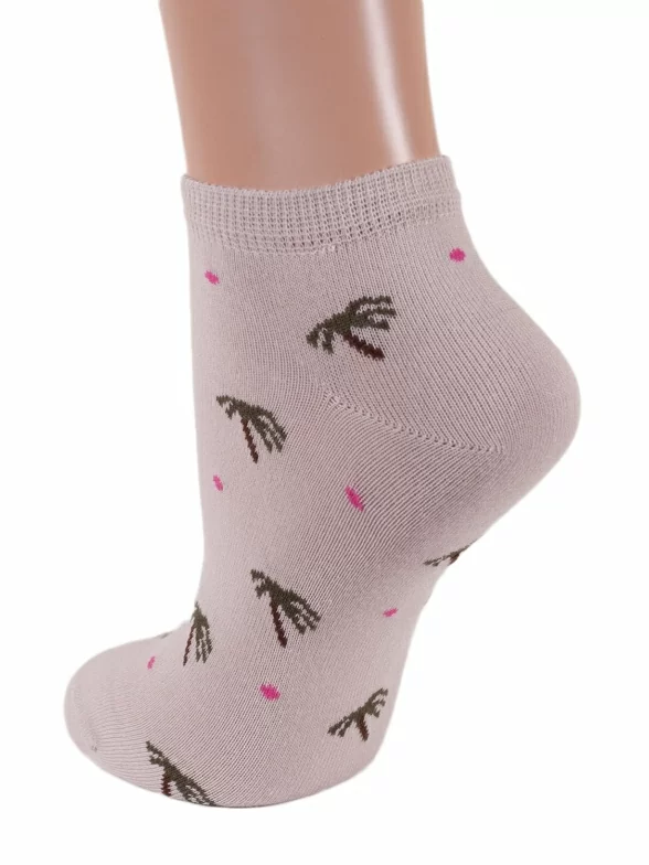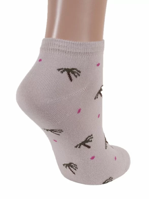 Укороченные женские носки из качественного трикотажа на основе хлопка. Модель декорирована цветным горохом и контрастными элементами: мыском, резинкой и пяткой.