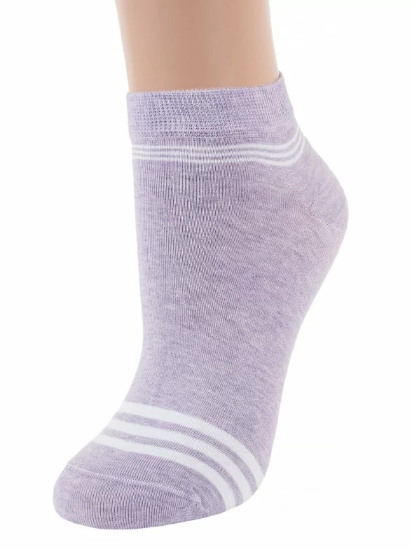 Короткие женские носки из плотного трикотажа. Модель в меланжевой расцветке оформлена контрастными тройными полосками. Носки невероятно приятны к телу и дарят особый комфорт.