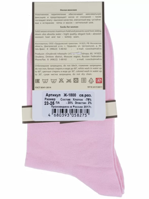 Однотонные женские носки классической длины. Их отличительная особенность – это ультравысокая резинка с распределённым давлением. Она не передавливает ноги и не дает носкам сползать. Носки очень приятны к телу за счет высокого содержания натурального хлопка.