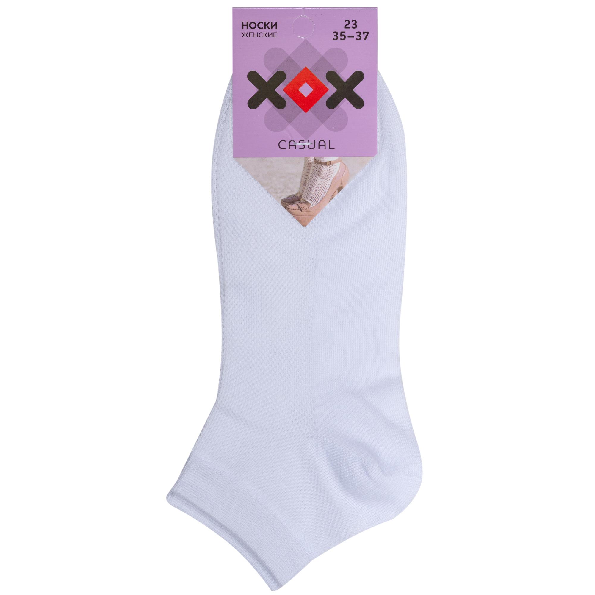 Женские носки ХОХ белого цвета. Укороченнная модель с вязкой "в сеточку". На 80% состоят из хлопка, а благодаря входящим в состав полиамида и эластана они хорошо тянутся и плотно прилегают к ноге. Сочетаются с любыми повседневными образами, а так же спортивной одеждой и обувью.