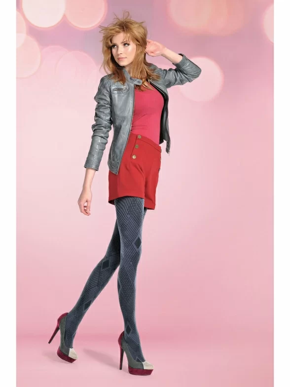 Эффектные фантазийные колготки со сложным геометрическим узором, который не только смотрится очень эффектно, но и сглаживает линии ног, делая их визуально стройнее.