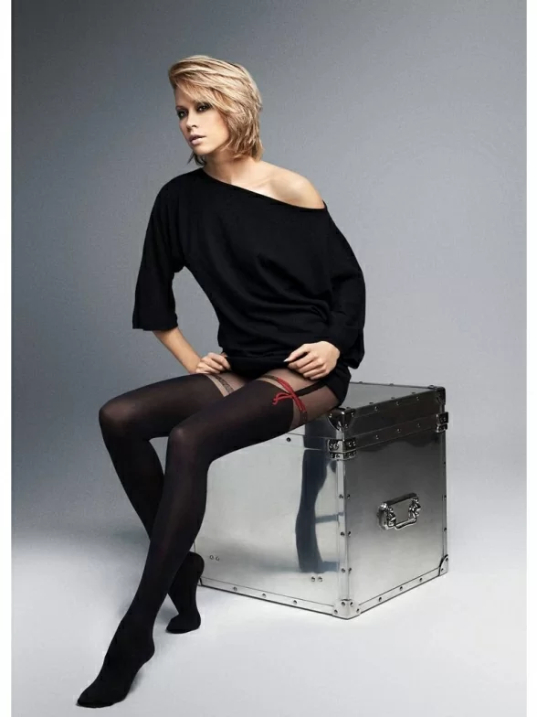Очаровательные колготки с имитацией чулок на подвязках. Плотность модели составляет 60 Den в зоне, оформленной под чулки и 20 Den вверху. Колготки также оформлены кокетливым принтом в виде бантика,